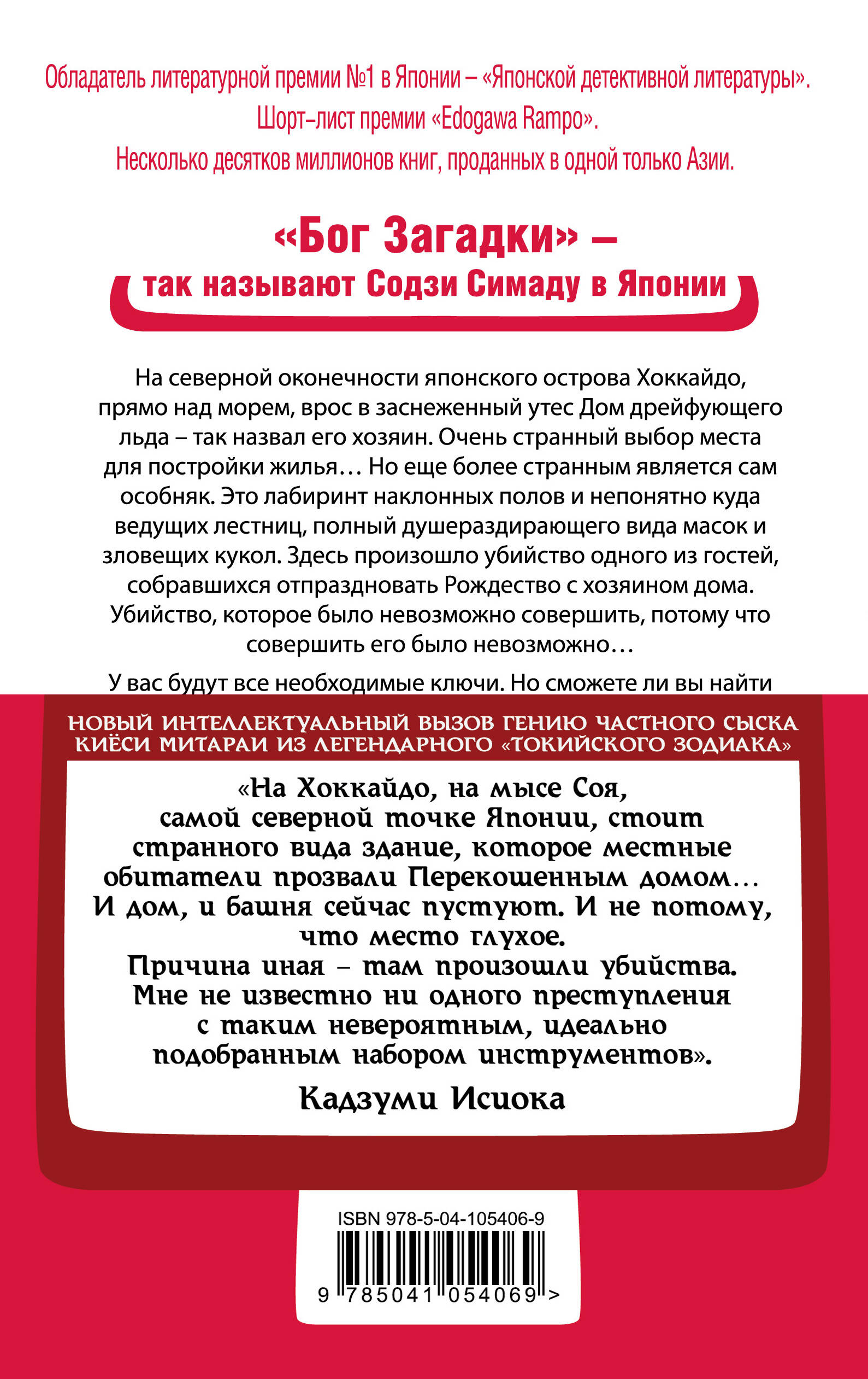 Обладатель литературной премии № 1 в Японии - «Японской детективной литературы». Шорт-лист премии «Edogawa Rampo». Несколько десятков миллионов книг, проданных в одной только Азии. Япония, Рождество 1983 года. Богатый промышленник Кодзабуро Хамамото собрал в своем особняке друзей и знакомых. Гости поражены его домом - причудливой конструкцией с множеством комнат, наклонными полами и непонятно куда ведущими лестницами, с «падающей» высокой башней, напоминающей Пизанскую. Все они восторгаются фантазией хозяина и готовятся весело встретить Рождество. Но их ожиданиям не суждено сбыться. Потому что в сочельник в доме происходит убийство. От удара ножом погибает шофер одного из приглашенных. Срочно вызванные полицейские в полном замешательстве. Ведь убийство невозможно было совершить - все обстоятельства и условия против этого. Да и мотива ни у кого нет… Пока инспектор с помощниками ломают голову, а гости пребывают в прострации, в доме происходит второе убийство, еще более невероятное. Связавшись с начальством, ошеломленные полицейские узнают, что к ним едет человек, способный найти преступника. Что это - астролог и гадатель из Токио Киёси Митараи. И что лишь он один способен разобраться в этой умопомрачительной головоломке… У вас будут все необходимые ключи. Но сможете ли вы найти отгадку прежде, чем это сделают сыщики? «Бог Загадки» - так называют Содзи Симаду в Японии. Это он создал хонкаку-детектив - новый жанр, столь популярный в Стране Восходящего Солнца. Детектив, в котором читателю предложена честная интеллектуальная игра: раскрыть дело раньше, чем это сделает главный герой. Содзи первым объединил европейскую классику с японской экзотикой, рационализм - с мистицизмом. Его великий сыщик - не просто человек острого ума и блестящих аналитических способностей, как Шерлок Холмс, Эркюль Пуаро и Ниро Вульф, но и астролог и предсказатель судьбы. Роман Содзи относится к категории «must read» для каждого уважающего себя японофила - он буквально пропитан интересной информацией об истории, культуре и географии Японии предвоенного периода. ПЕРЕВОД С ЯПОНСКОГО ЯЗЫКА. -------------------------------------------------- «Великий Содзи Симада буквально изобрел целый поджанр "логической загадки"». - The Guardian «Хитроумнейше и захватывающе экзотично». - Japan Times| Издательство | ООО "Издательство "Эксмо" |