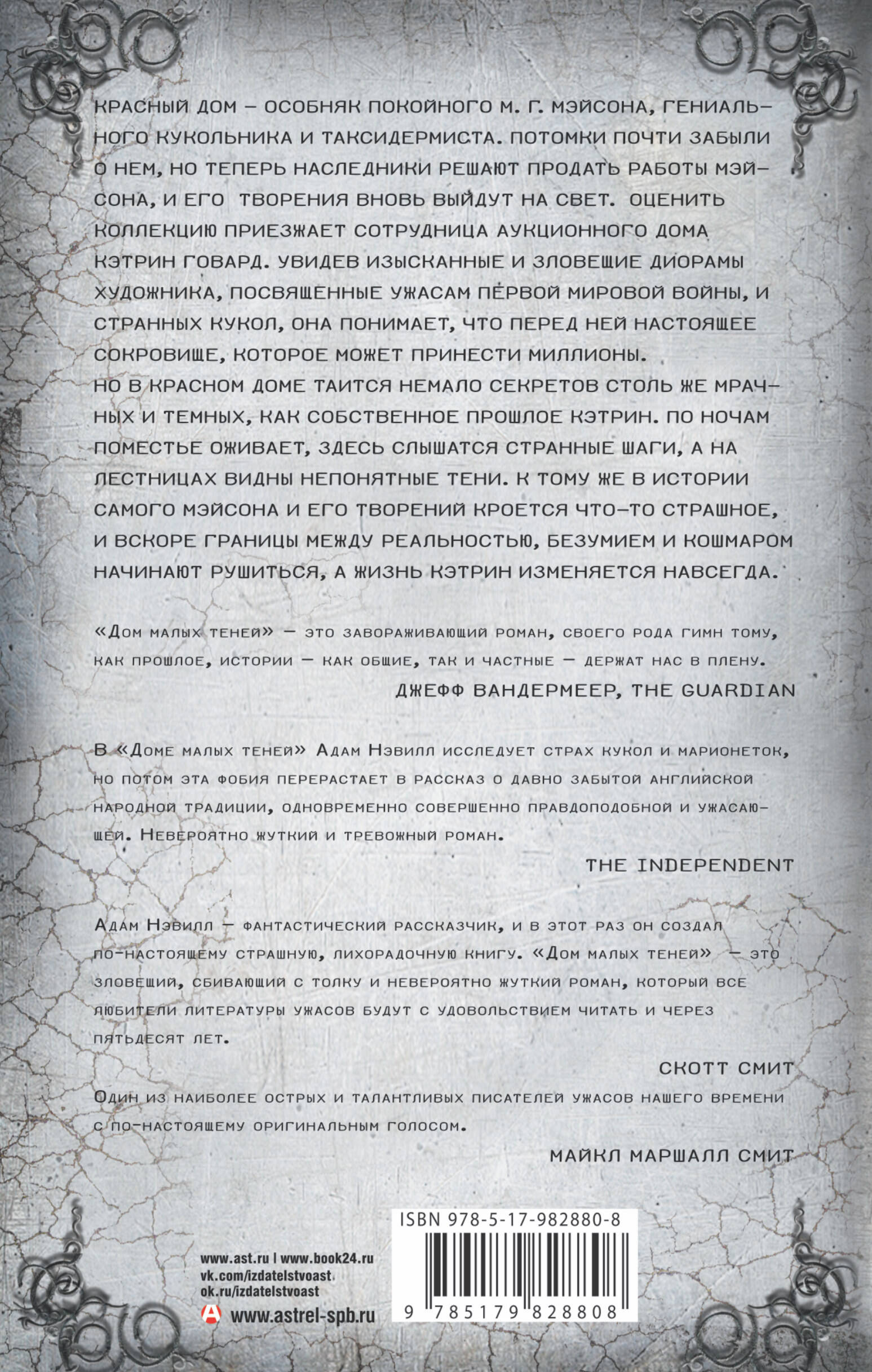 Красный Дом - особняк покойного М. Г. Мэйсона, гениального кукольника и таксидермиста. Потомки почти забыли о нем, но теперь наследники решают продать работы Мэйсона, и его творения вновь выйдут на свет. Оценить коллекцию приезжает сотрудница аукционного дома Кэтрин Говард. Увидев изысканные и зловещие диорамы художника, посвященные ужасам Первой мировой войны, и странных кукол, она понимает, что перед ней настоящее сокровище, которое может принести миллионы. Но в Красном Доме таится немало секретов столь же мрачных и темных, как собственное прошлое Кэтрин. По ночам поместье оживает, здесь слышатся странные шаги, а на лестницах видны непонятные тени. К тому же в истории самого Мэйсона и его творений кроется что-то страшное, и вскоре границы между реальностью, безумием и кошмаром начинают рушиться, а жизнь Кэтрин изменяется навсегда.| Издательство | ИЗДАТЕЛЬСТВО "АСТ" |