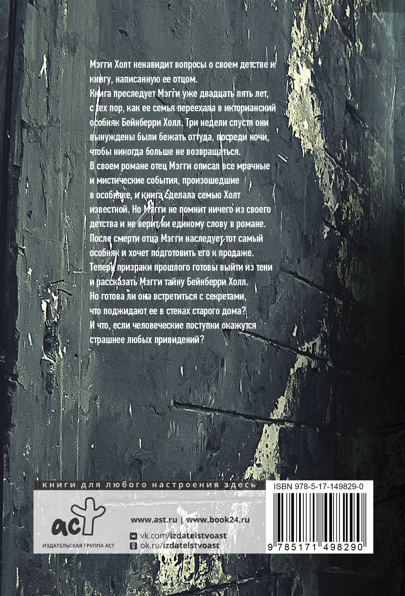 - Мгновенный бестселлер по версии New York Times. - Одна из лучших книг 2020 года по версии USA Today. - Психологический триллер, в котором за образом «дома с привидениями» скрывается продуманный сюжет и правдоподобные персонажи. - Книги Райли Сейгера не раз рекомендовал сам Стивен Кинг. Мэгги Холт ненавидит вопросы о своем детстве и книгу, написанную ее отцом. Книга не дает ей покоя уже 25 лет - с тех пор как семья Мэгги переехала в викторианский особняк Бейнберри Холл, а затем в спешке покинула его посреди ночи. В своем романе отец Мэгги описал все мрачные и мистические события, произошедшие в особняке, и книга сделала семью Холт известной. Но Мэгги не помнит ничего из своего детства и не верит ни единому слову в романе. После смерти отца Мэгги наследует тот самый особняк и хочет подготовить его к продаже. Теперь призраки прошлого готовы выйти из тени и рассказать ей тайну особняка. Но готова ли она встретиться с секретами, что поджидают ее в стенах старого дома? И что, если человеческие поступки окажутся страшнее любых привидений?| Издательство | АСТ |