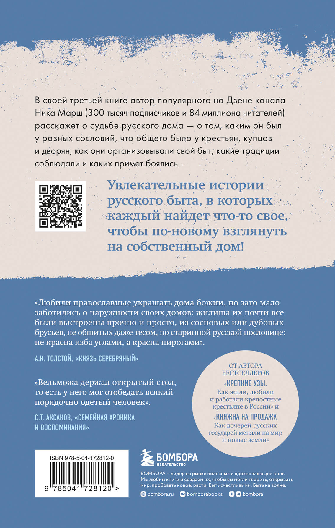 Новинка от Ники Марш! В этот раз автор исторических бестселлеров «Крепкие узы. Как жили, любили и работали крепостные крестьяне в России» и «Княжна на продажу. Как дочерей русских государей меняли на мир и новые земли» приоткроет завесу тайны над секретами и традициями русского дома. Каким был настоящий русский дом на протяжении веков? Что было общего у избы крестьянина, хором купца и дворянского дворца? Как жили и отдыхали дома? Как отмечали праздники, организовывали быт и какие приметы соблюдали разные сословия? Обо всем этом и многом другом популярный блогер Ника Марш расскажет в своей третьей книге. Узнайте об истории и домашних традициях России, посмотрите на свой дом по-новому!| Издательство | ООО "Издательство "Эксмо" |
