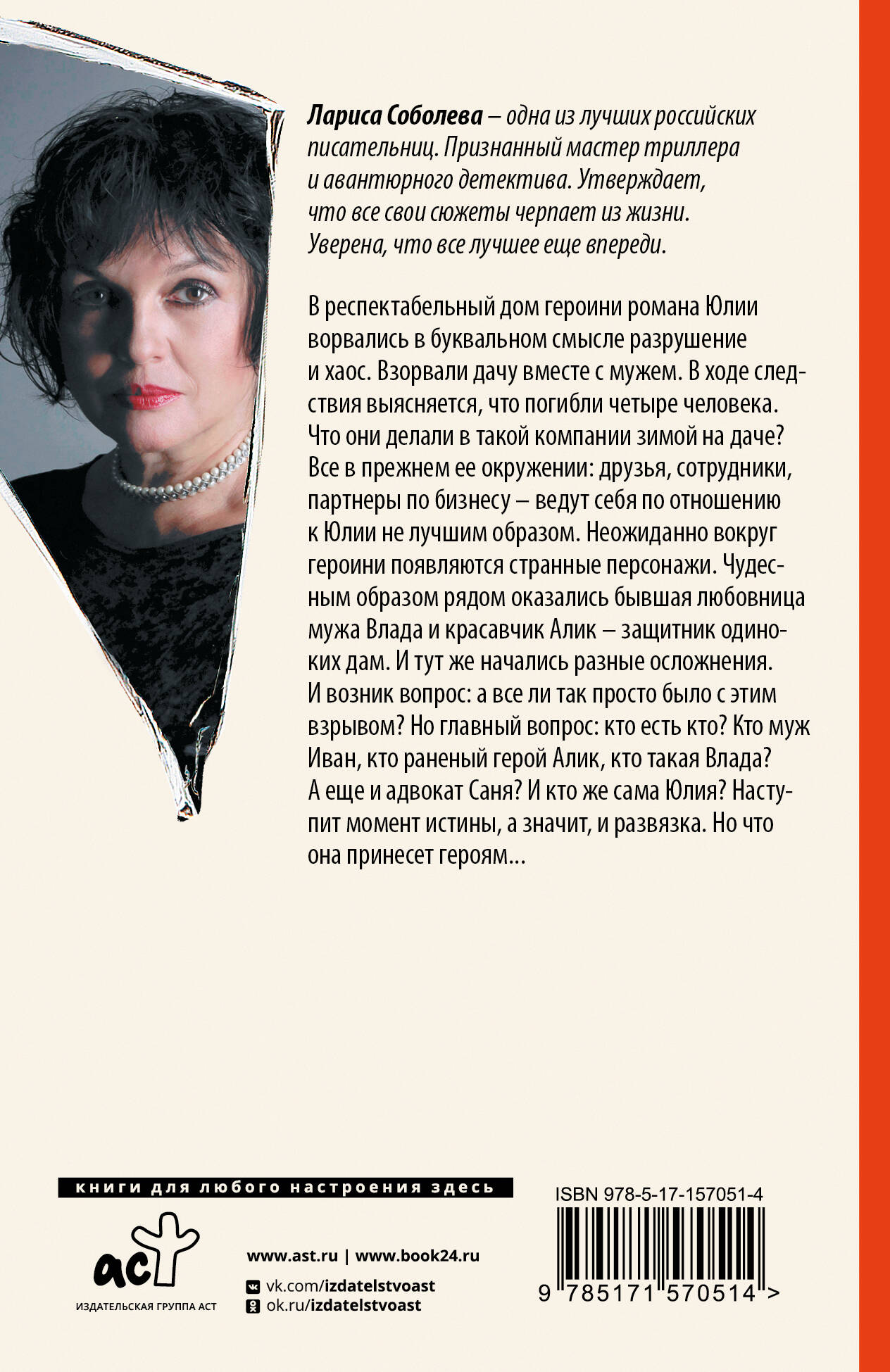 В респектабельный дом героини романа Юлии ворвались в буквальном смысле разрушение и хаос. Взорвали дачу вместе с мужем. В ходе следствия выясняется, что погибли четыре человека. Что они делали в такой компании зимой на даче? Все в прежнем ее окружении: друзья, сотрудники, партнеры по бизнесу - ведут себя по отношению к Юлии не лучшим образом. Неожиданно вокруг героини появляются странные персонажи. Чудесным образом рядом оказались бывшая любовница мужа Влада и красавчик Алик - защитник одиноких дам. И тут же начались разные осложнения. И возник вопрос: а все ли так просто было с этим взрывом? Но главный вопрос: кто есть кто? Кто муж Иван, кто раненый герой Алик, кто такая Влада? А еще и адвокат Саня? И кто же сама Юлия? Наступит момент истины, а значит, и развязка. Но что она принесет героям...