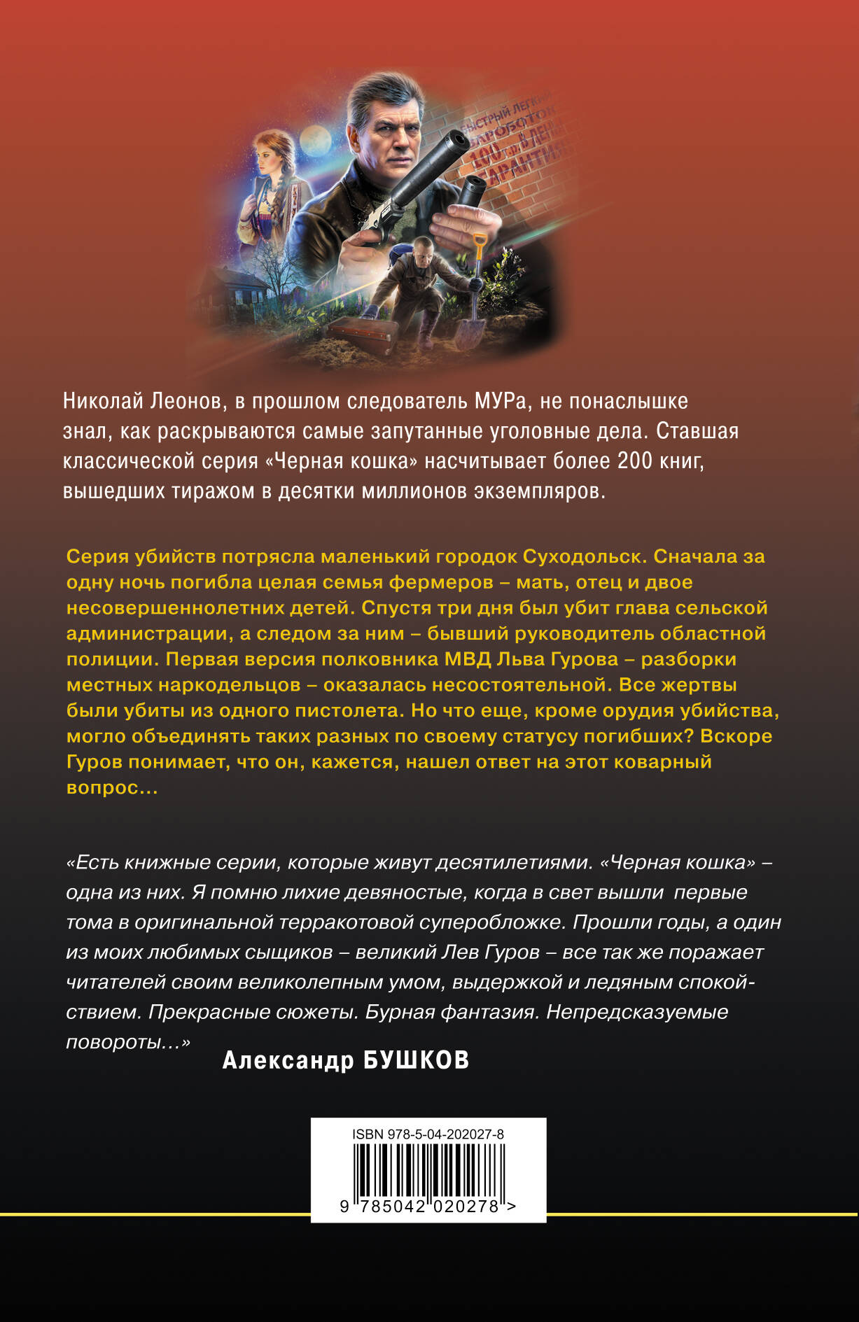 Легендарный детективный тандем Леонов - Макеев. Серия убийств потрясла маленький городок Суходольск. Сначала за одну ночь погибла целая семья фермеров - мать, отец и двое несовершеннолетних детей. Спустя три дня был убит глава сельской администрации, а следом за ним - бывший руководитель областной полиции. Первая версия полковника МВД Льва Гурова - разборки местных наркодельцов - оказалась несостоятельной. Все жертвы были убиты из одного пистолета. Но что еще, кроме орудия убийства, могло объединять таких разных по своему статусу погибших? Вскоре Гуров понимает, что он, кажется, нашел ответ на этот коварный вопрос… Николай Леонов, в прошлом следователь МУРа, не понаслышке знал, как раскрываются самые запутанные уголовные дела. Поэтому каждая его книга - это правдивая захватывающая история с непредсказуемой интригой и неожиданным финалом. Главный герой этих книг, полковник Лев Гуров - сыщик высокого класса, к тому же с массой положительных человеческих качеств. Его уважают друзья, боятся враги и любят женщины. Он - настоящий отечественный супермен. Романы о Льве Гурове вот уже сорок лет неизменно привлекают поклонников отечественного детектива. Ставшая классической серия «Черная кошка» насчитывает более 200 книг, вышедших тиражом в десятки миллионов экземпляров.| Издательство | ООО "Издательство "Эксмо" |