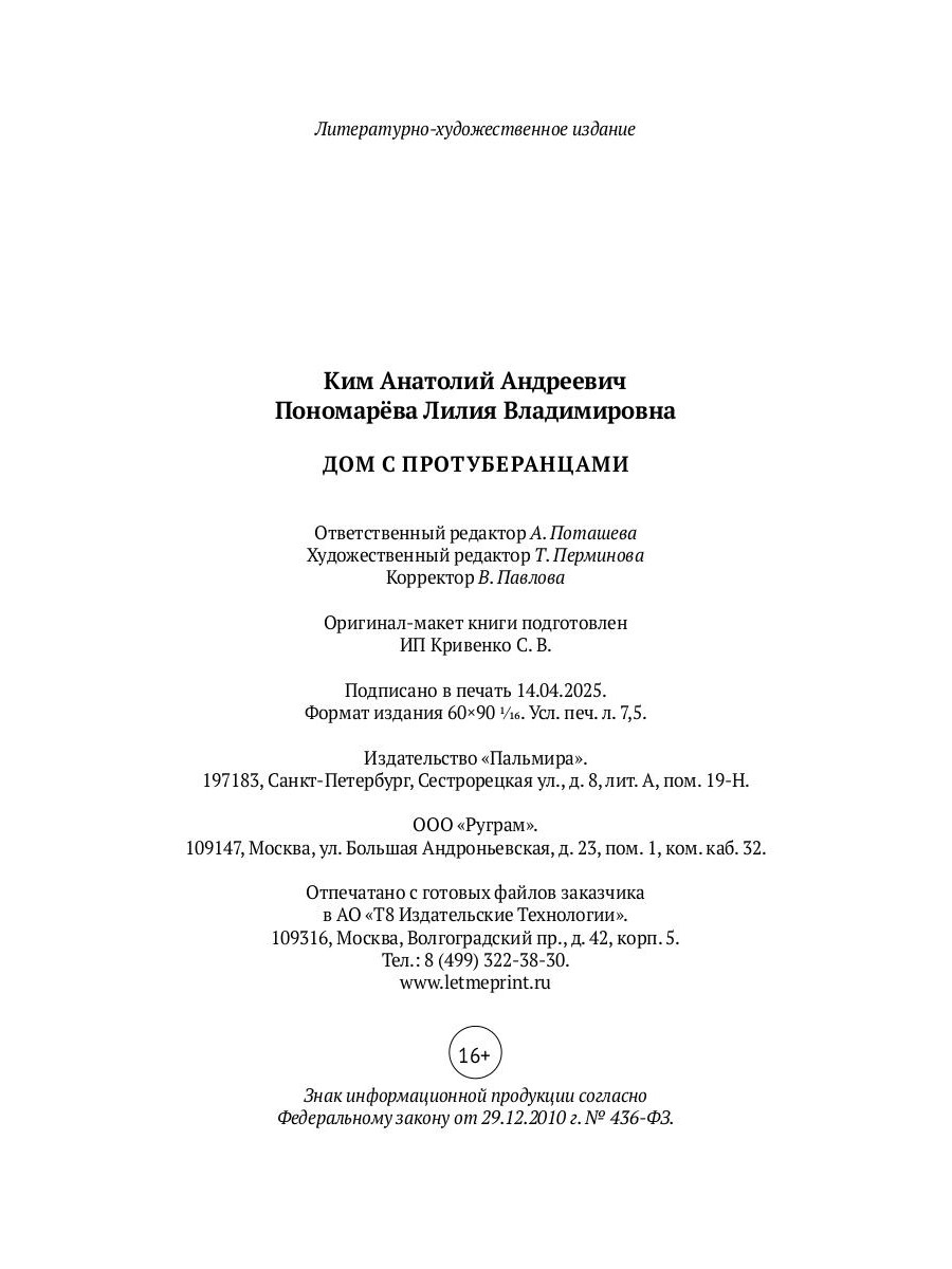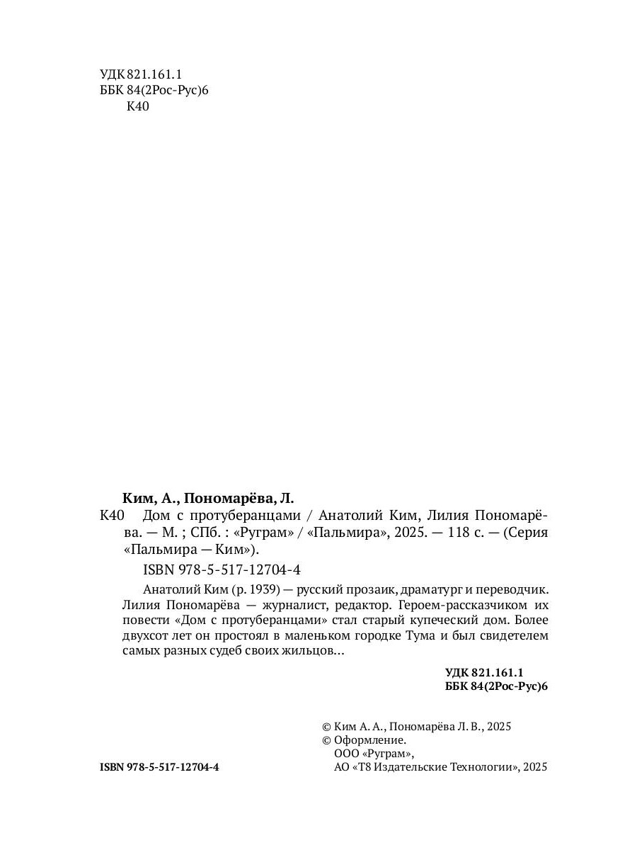 Анатолий Ким (р. 1939) - русский прозаик, драматург и переводчик. Лилия Пономарёва - журналист, редактор. Героем-рассказчиком их повести «Дом с протуберанцами» стал старый купеческий дом. Более двухсот лет он простоял в маленьком городке Тума и был свидетелем самых разных судеб своих жильцов…| Издательство | Т8 RUGRAM |