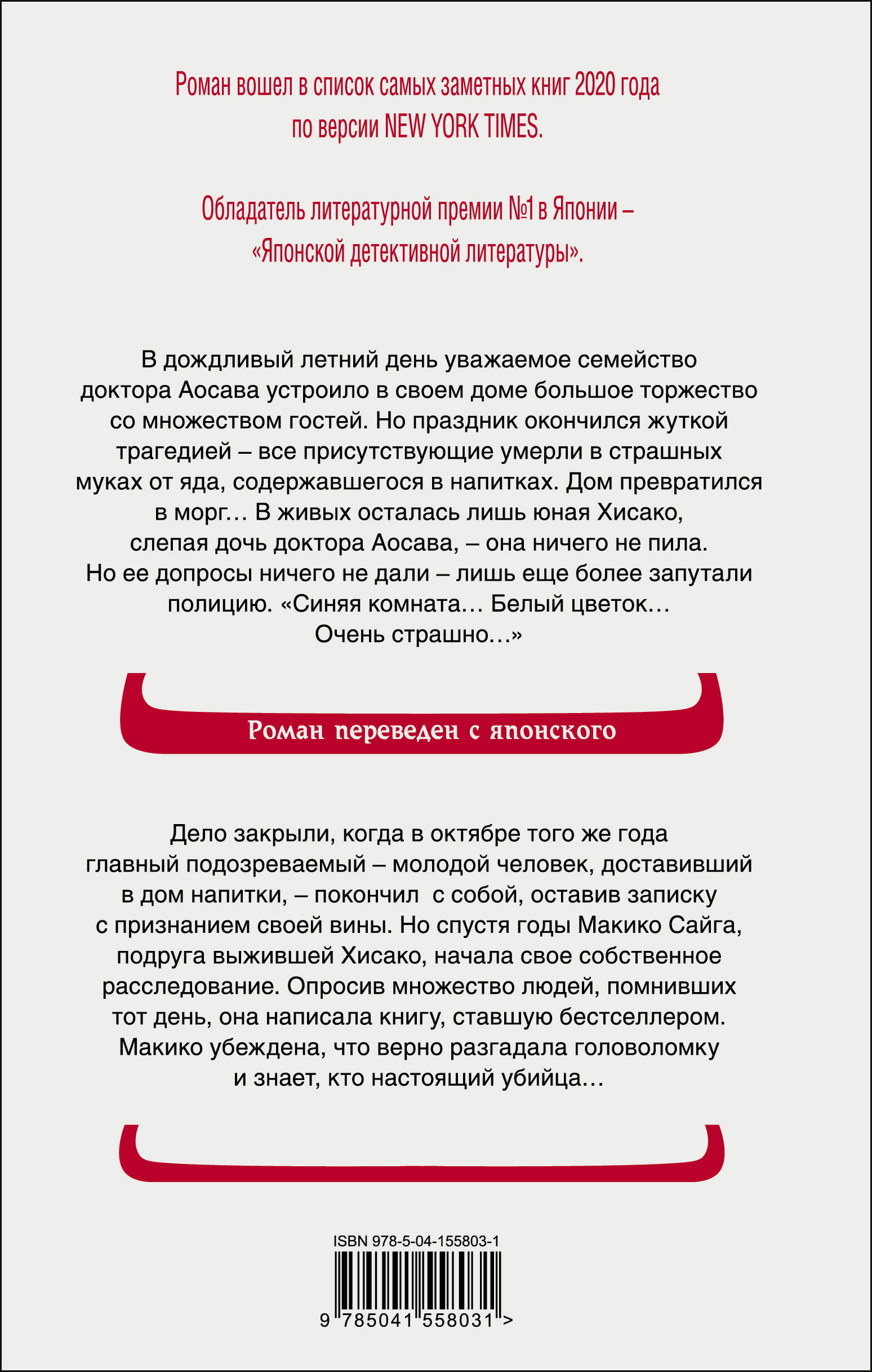 Роман вошел в список самых выдающихся книг 2020 года по версии NEW YORK TIMES. Обладатель литературной премии № 1 в Японии - «Японской детективной литературы». В дождливый летний день уважаемое семейство доктора Аосава устроило в своем доме большое торжество с множеством гостей. Но праздник окончился жуткой трагедией - все присутствующие умерли в страшных муках от яда, содержавшегося в напитках. Дом превратился в морг… В живых осталась лишь юная Хисако, слепая дочь доктора Аосава, - она ничего не пила. Но ее допросы ничего не дали - лишь еще более запутали полицию. «Синяя комната… Белый цветок… Очень страшно…» Дело закрыли, когда в октябре того же года главный подозреваемый - молодой человек, доставивший в дом напитки - покончил с собой, оставив записку с признанием своей вины. Но спустя годы Макико Сайга, подруга выжившей Хисако, начала свое собственное расследование. Опросив множество людей, помнивших тот день, она написала книгу, ставшую бестселлером. Макико убеждена, что верно разгадала головоломку и знает, кто настоящий убийца… Роман переведен с японского. Этот мрачный, атмосферный и отчасти философский роман быстро стал национальным бестселлером и очаровал сотни тысяч читателей. Он заметно расширил рамки стиля син-хонкаку, созданного Содзи Симадой и Юкито Аяцудзи. «Странный, но захватывающий роман». - The New York Times «Влажная жара прибрежного городка сама по себе становится характерной чертой романа. Роскошный и странный, он завораживает. Онда заставляет вас осознать другой, иной мир, скрытый в повествовании». - The Times «Загадочный и захватывающий детектив. Необычная техника повествования Онды, с использованием различных точек зрения, выраженных в ответах на вопросы интервьюера, порождает ощущение "матрешки". Читатели поймут, почему этот роман был удостоен ежегодной премии в области японской детективной литературы». - Publishers Weekly «Супердетектив в полном смысле этого слова». - Asahi Shimbun «Этот леденящий кровь шедевр познакомит вас с темными местами в вашем собственном сердце». - Hokkaido Shimbun| Издательство | ООО "Издательство "Эксмо" |
