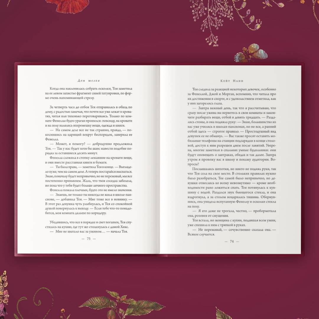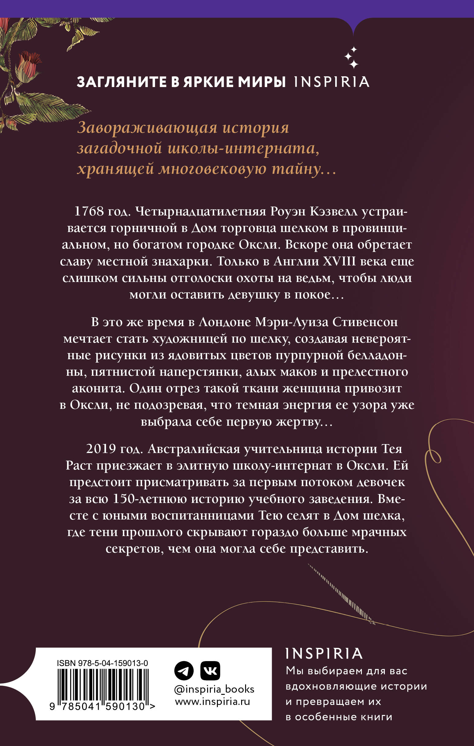 Завораживающая история загадочной школы-интерната, хранящей многовековую тайну… 2019 год. Австралийская учительница истории Тея Раст приезжает в элитную школу-интернат в Оксли. Ей предстоит присматривать за первым потоком девочек за всю 150-летнюю историю учебного заведения. Вместе с юными воспитанницами Тею селят в Дом шелка, где тени прошлого скрывают гораздо больше мрачных секретов, чем она могла себе представить. 1768 год. Четырнадцатилетняя Роуэн Кэзвелл устраивается горничной в Дом торговца шелком в провинциальном, но богатом городке Оксли. Вскоре она обретает славу местной знахарки. Только в Англии XVIII века еще слишком сильны отголоски охоты на ведьм, чтобы люди могли оставить девушку в покое… В это же время, в Лондоне, Мэри-Луиза Стивенсон мечтает стать художницей по шелку, создавая невероятные рисунки из ядовитых цветов пурпурной белладонны, пятнистой наперстянки, алых маков и прелестного аконита. Один отрез такой ткани женщина провозит в Оксли, не подозревая, что темная энергия ее узора уже выбрала себе первую жертву… _________________________________________________________ «Изысканно написанная, эта яркая история может околдовать вас». - Woman «Совершенно завораживающий». - Наташа Лестер, автор бестселлеров New York Times «Плавно переходя от прошлого к настоящему и используя мощные повествовательные голоса трех очень разных женщин, Нанн создает потрясающую атмосферу… Многослойная и насыщенная неизвестностью история о привидениях, полная фигур, теней, неземной музыки, скрипов в ночи и беспокойных духов». - Lancashire Post