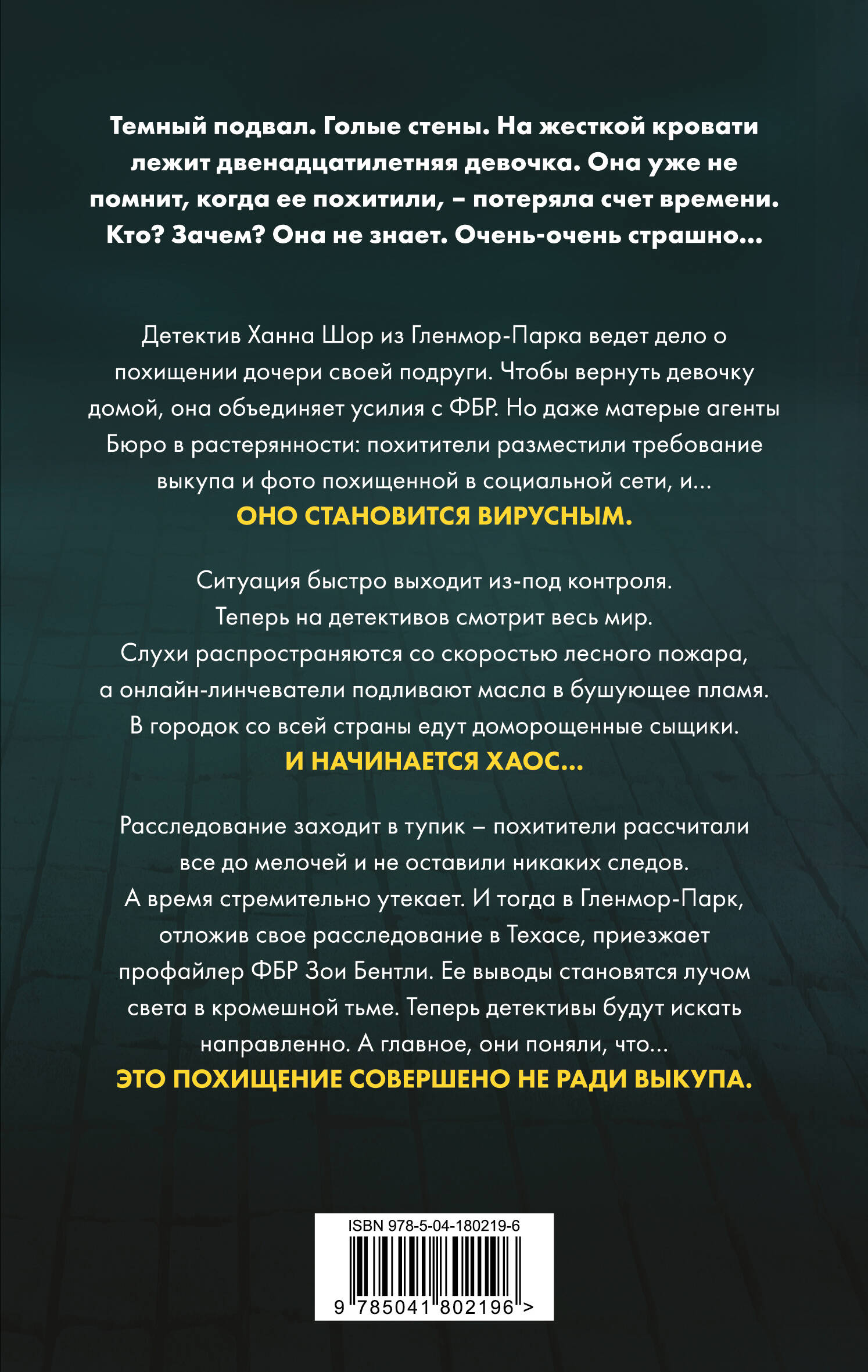 РАДИ ЭТОГО ЗОИ БЕНТЛИ ОТВЛЕКЛАСЬ ОТ ДЕЛА «ЗАЖИВО В ТЕМНОТЕ». ТРЕТИЙ РОМАН ИЗ ЦИКЛА «ГЛЕНМОР-ПАРК». Темный подвал. Голые стены. На жесткой кровати лежит двенадцатилетняя девочка. Она уже не помнит, когда ее похитили, - потеряла счет времени. Кто? Зачем? Она не знает. Очень-очень страшно… Детектив Ханна Шор из Гленмор-Парка ведет дело о похищении дочери своей подруги. Чтобы вернуть девочку домой, она объединяет усилия с ФБР. Но даже матерые агенты Бюро в растерянности: похитители разместили требование выкупа и фото похищенной в социальной сети, и… ОНО СТАНОВИТСЯ ВИРУСНЫМ. Ситуация быстро выходит из-под контроля. Теперь на детективов смотрит весь мир. Слухи распространяются со скоростью лесного пожара, а онлайн-линчеватели подливают масла в бушующее пламя. В городок со всей страны едут доморощенные сыщики. И НАЧИНАЕТСЯ ХАОС… Расследование заходит в тупик - похитители рассчитали всё до мелочей и не оставили никаких следов. А время стремительно утекает. И тогда в Гленмор-Парк, отложив свое расследование в Техасе, приезжает профайлер ФБР Зои Бентли. Ее выводы становятся лучом света в кромешной тьме. Теперь детективы будут искать направленно. А главное, они поняли, что… ЭТО ПОХИЩЕНИЕ СОВЕРШЕНО НЕ РАДИ ВЫКУПА.| Издательство | ООО "Издательство "Эксмо" |