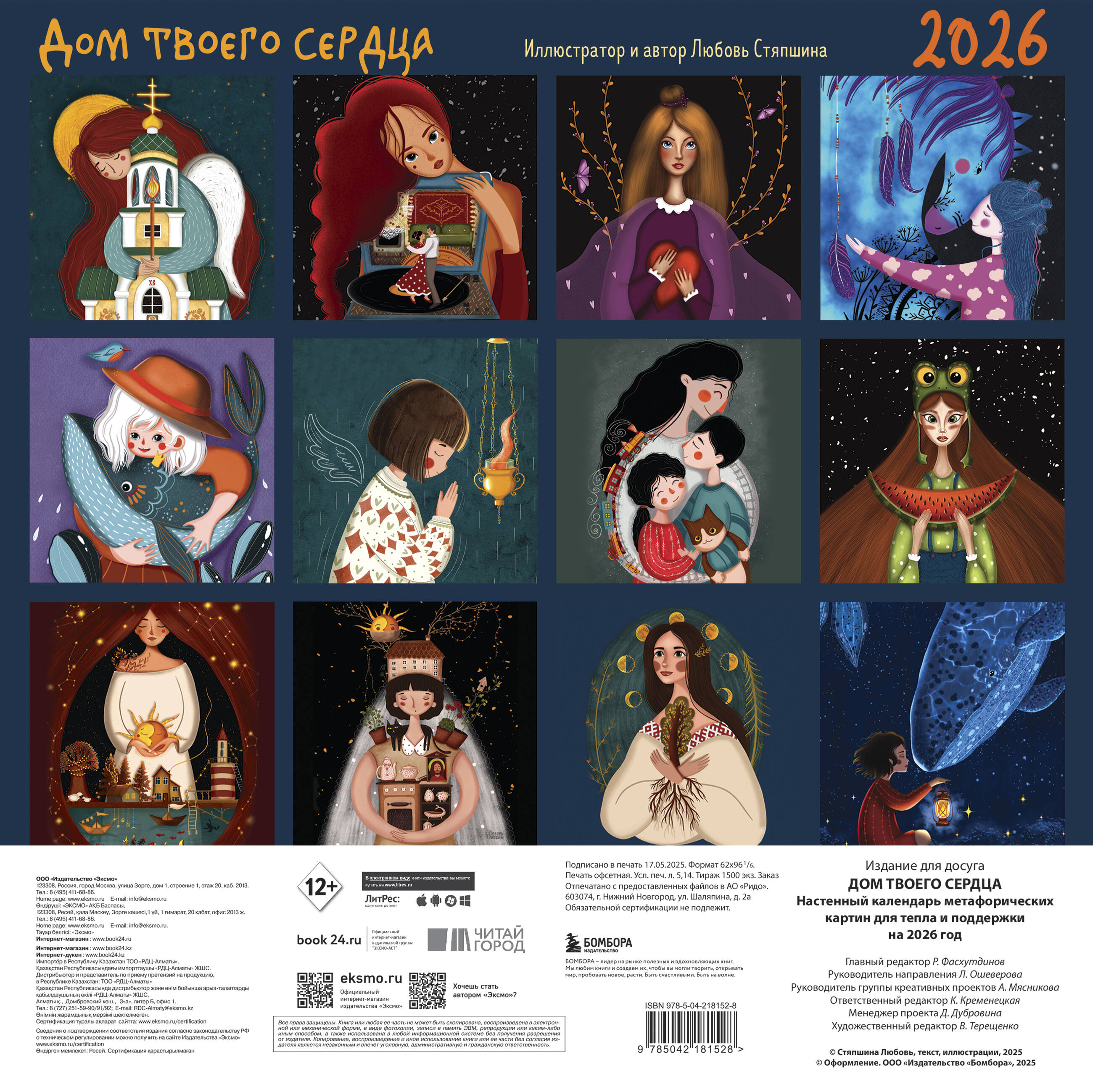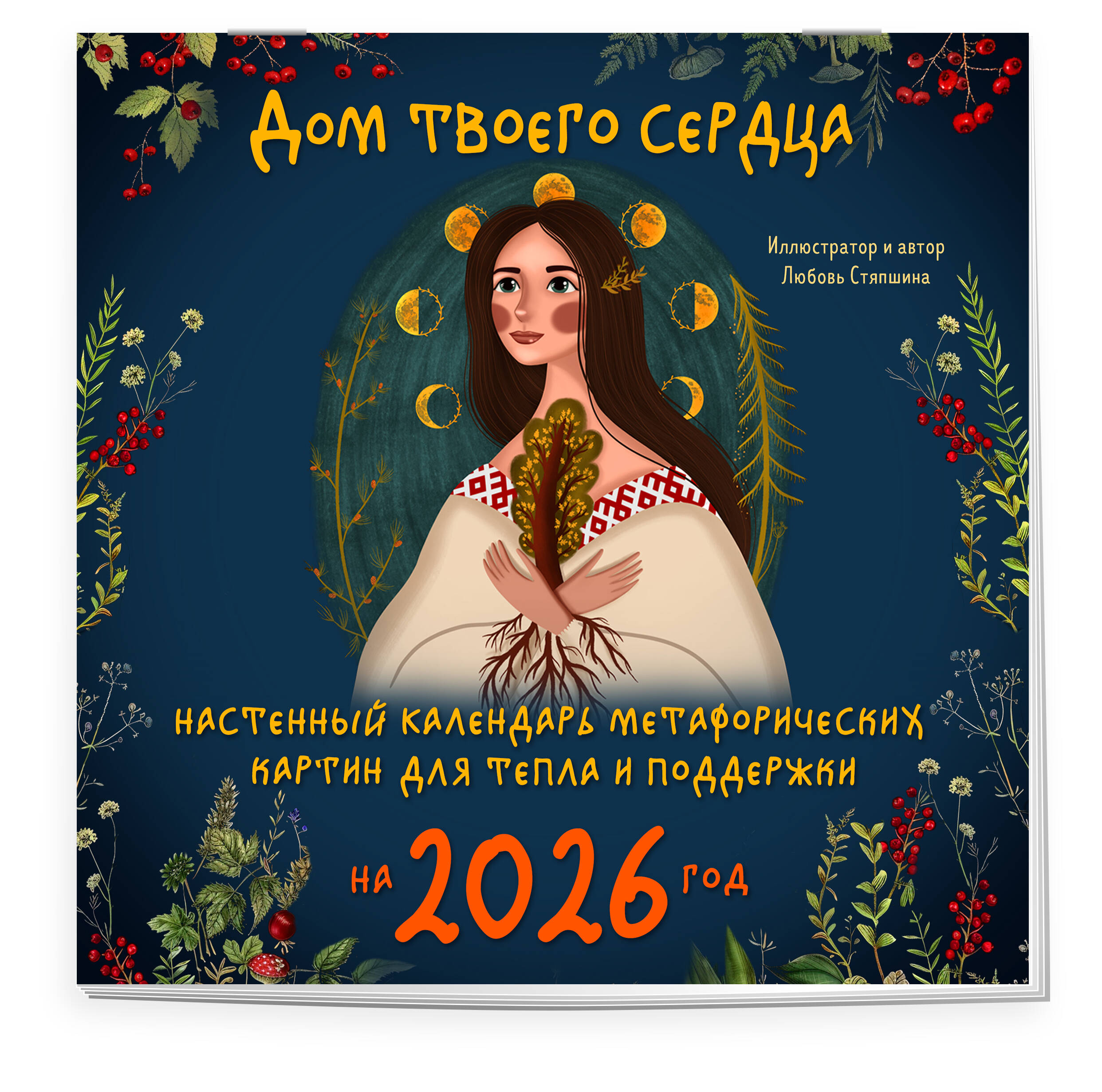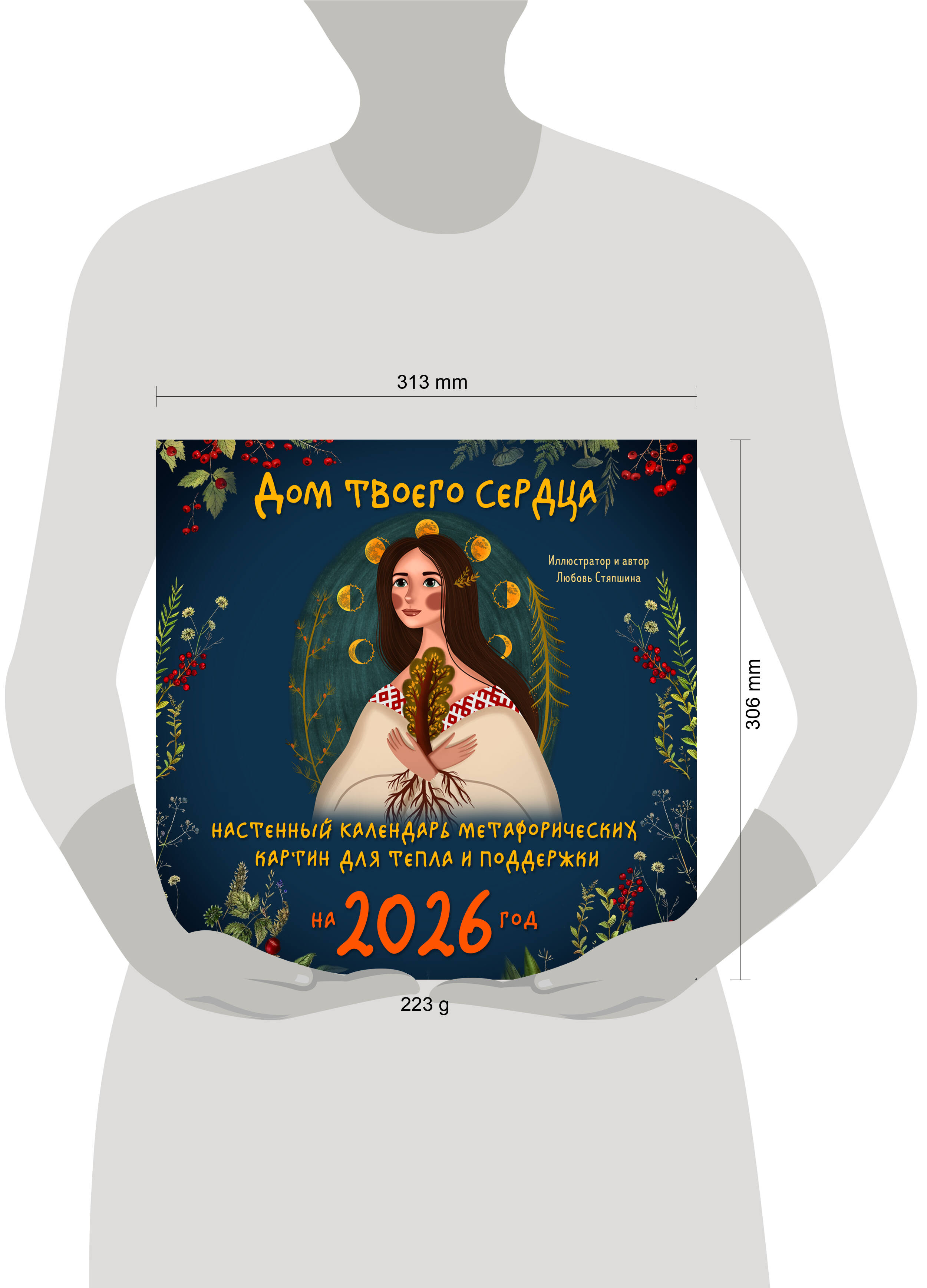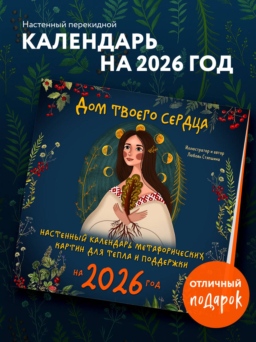 О серии: Наши настенные календари отличаются высоким качеством исполнения! Тщательно подобранные иллюстрации, напечатанные на глянцевой бумаге высочайшего качества, станут настоящим украшением дома, а в календарной сетке найдется место для ваших планов: большие клетки позволят делать записи и организовать свой год! В календаре также отмечены все государственные праздники. В серии настенных календарей издательства «ЭКСМО» каждый найдет тему по вкусу: великие художники, великолепные подборки с самыми знаменитыми произведениями искусства, легендарные кинематографические саги и игры, главные книжные авторы и бестселлеры, фотографии и иллюстрации любимых животных и многое-многое другое! О календаре: Отбросьте все, что истощает вас и забирает силы и время. Оставьте все, что наполняет и помогает найти новые пути и возможности. Календарь метафорических картин поможет обрести внутреннюю опору и украсит жизнь яркими и необычными образами. Благодаря особой терапевтической манере, в которой соединяются искусство и послания для женщин, вы получите бережный инструмент для погружения в целительное творческое пространство, наполняющее вашу жизнь силой и энергией. Календарь создан по мотивам открыток «Дом твоего сердца», «Женские миры» и «По зову сердца» автора и иллюстратора Любови Стяпшиной. Технические параметры: - Тип календаря - настенный перекидной. - Год - 2026. - Календарная сетка - с разбивкой по месяцам. - Вид скрепления - скрепка. - Ширина - 30 см. - Высота - 30 см. - Внутренний блок - мелованная бумага 115 г/м2. - Подложка - плотный гофрокартон для поддержания формы. - Индивидуальная упаковка в плотный целлофановый пакет.| Издательство | ООО "Издательство "Эксмо" |