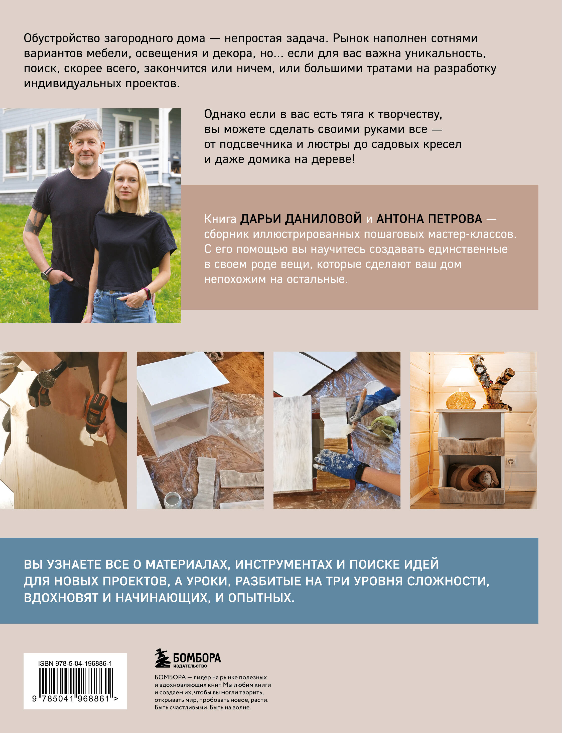 Сколько стоит обустроить загородный дом, чтобы сделать его индивидуальным? Наверняка очень дорого: нестандартный проект просто не может быть бюджетным. Но что, если... вы все сделаете сами? Кажется, что это слишком сложно и ничего не получится? Дарья Данилова и Антон Петров, авторы книги и блога dom_uozera, докажут, что для творческого человека нет невозможного. Построив дачный дом на берегу озера, они сами придумали и создали для него мебель и декор, чем вдохновили своих читателей. Вдохновят и вас! Дарья и Антон расскажут, где найти идею, как выразить ее в чертеже и какими инструментами воплотить. А главное - где добыть материал, ведь покупать его не всегда обязательно. Вас ждет подробная теоретическая часть, где вы познакомитесь с основным оборудованием, материалами и способами их обработки, а затем - 18 пошаговых мастер-классов, разделенных на три уровня сложности. - Если вы никогда не работали с лобзиком и шлифмашиной, начните с простых изделий: кашпо, подсвечника или ящика для цветов. - Если вы уже уверены в своих силах, реализуйте более серьезные проекты: полку для вина, тумбочку или люстру в стиле лофт. - Для самых продвинутых - сложные, масштабные мастер-классы: шезлонги «Адирондак» для взрослых и детей, стол для веранды и детский домик на дереве. Творите, придумывайте свои проекты - и пусть ваш дом будет особенным!| Издательство | ООО "Издательство "Эксмо" |