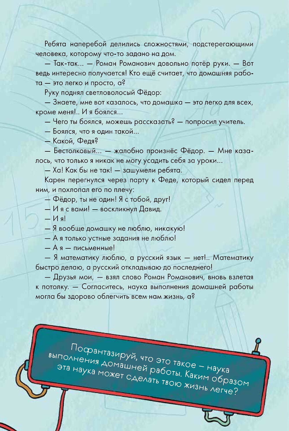 Новая книга Маши Рупасовой в серии Life skills расскажет о том, как правильно делать домашнюю работу, чтобы это не превращалось в пытку для всей семьи. Новая четверть в 303 «А» классе ознаменовалась полетом на Луну. И хотя эта четверть считается самой легкой, работы всем хватает. Особенно домашней работы. А любое неприятное дело хочется отложить до последнего. Вот и теперь на вопрос о выполненном домашнем задании класс горестно начинает вздыхать. Тогда классный руководитель 303 «А» решает, что пришло время постичь науку выполнения домашнего задания. Из этой ваш ребенок узнает: почему мы откладываем домашнюю работу, что такое прокрастинация, как обмануть мозг и сформировать привычку, как отдыхать перед уроками, чтобы за них было просто садиться, как правильно запоминать информацию. И другие секреты, которые помогут делать уроки вовремя и без стресса. Серия Life skills - это рассказы, благодаря которым дети без труда усвоят важные социальные и эмоциональные уроки.| Издательство | Альпина Паблишер |
