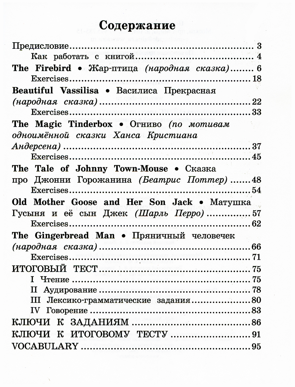 Книга представляет собой сборник адаптированных народных и авторских сказок разных стран на английском языке. На страницах этой книги юные читатели вновь встретятся с волшебной Жар-птицей, находчивым солдатом, Василисой Прекрасной, Матушкой Гусыней и её сыном Джеком, а также с другими известными сказочными персонажами. Разнообразие волшебных, бытовых и приключенческих сюжетов, тонкий юмор и образный английский язык делают чтение этих сказок не только увлекательным, но и полезным с точки зрения изучения языка. Данное пособие разработано в соответствии с требованиями действующего Федерального государственного образовательного стандарта (ФГОС). Оно поможет учащимся начальной школы подготовиться к обязательному для каждого ученика итоговому экзамену по английскому языку в новом формате. Сказки адаптированы в учебных целях до уровня Beginner. При этом по возможности сохранено образное и стилевое богатство английского языка. После текста каждой из них следуют комментарий и перевод трудных слов и выражений, а также упражнения, которые учитывают новые требования итоговой аттестации. Они направлены не только на проверку понимания текста, но и на отработку лексики, грамматики, а также развитие умений чтения, аудирования, устной и письменной речи. Упражнения имеют два уровня сложности, что даёт возможность каждому ученику продемонстрировать свой уровень знаний и умений. В конце книги помещён словарь, тест в формате итогового экзамена за 4-й класс, включающий задания по аудированию, а также ответы ко всем упражнениям и тестовым заданиям. Пособие адресовано учащимся 3-4 классов образовательных учреждений, а также широкому кругу лиц, изучающих английский язык.| Издательство | Айрис-Пресс |