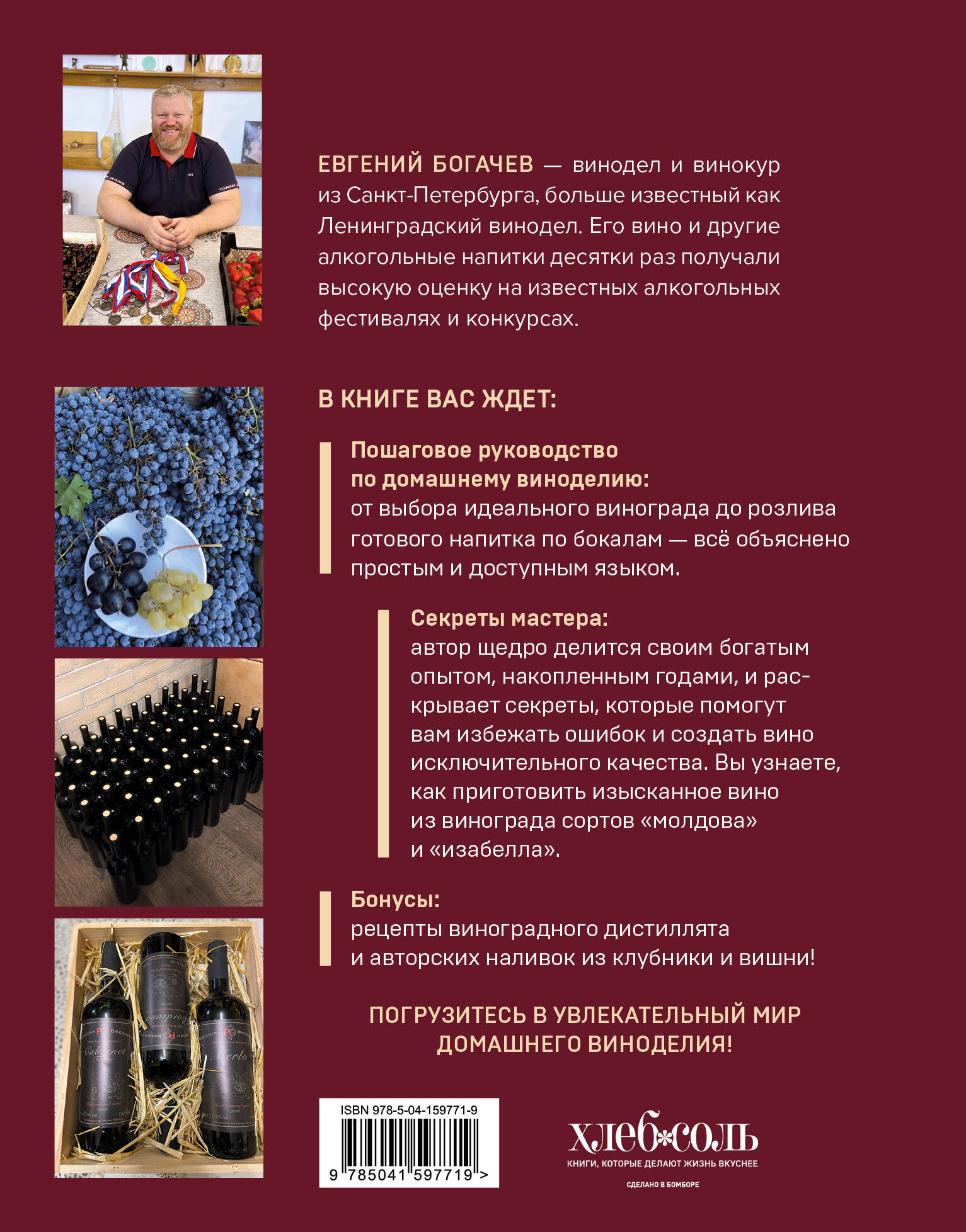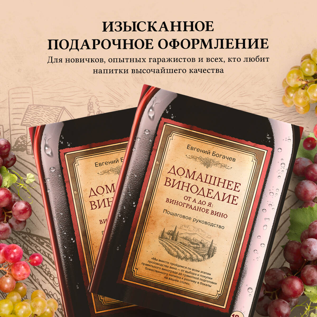 Забудьте о сомнениях! Вам не нужны огромные виноградники, сложное оборудование или многолетний опыт. Эта книга станет вашим надежным проводником в мир домашнего виноделия, а ваши старания вознаградятся бокалом благородного напитка, созданного своими руками! Евгений Богачев - винодел и винокур из Санкт-Петербурга, больше известен как «ленинградский винодел». Его вино и другие алкогольные напитки десятки раз получали высокую оценку на известных алкогольных фестивалях и конкурсах. В книге вас ждет: - Пошаговое руководство по домашнему виноделию: от выбора идеального винограда до розлива готового напитка по бокалам - всё объяснено простым и доступным языком. - Секреты мастера: автор щедро делится своим богатым опытом, накопленным годами, и раскрывает секреты, которые помогут вам избежать ошибок и создать вино исключительного качества. Вы узнаете, как приготовить изысканное вино из винограда сортов «Молдова» и «Изабелла». Бонусы: рецепты виноградного дистиллята, и авторских наливок из клубники и вишни! Погрузитесь в увлекательный мир домашнего виноделия!