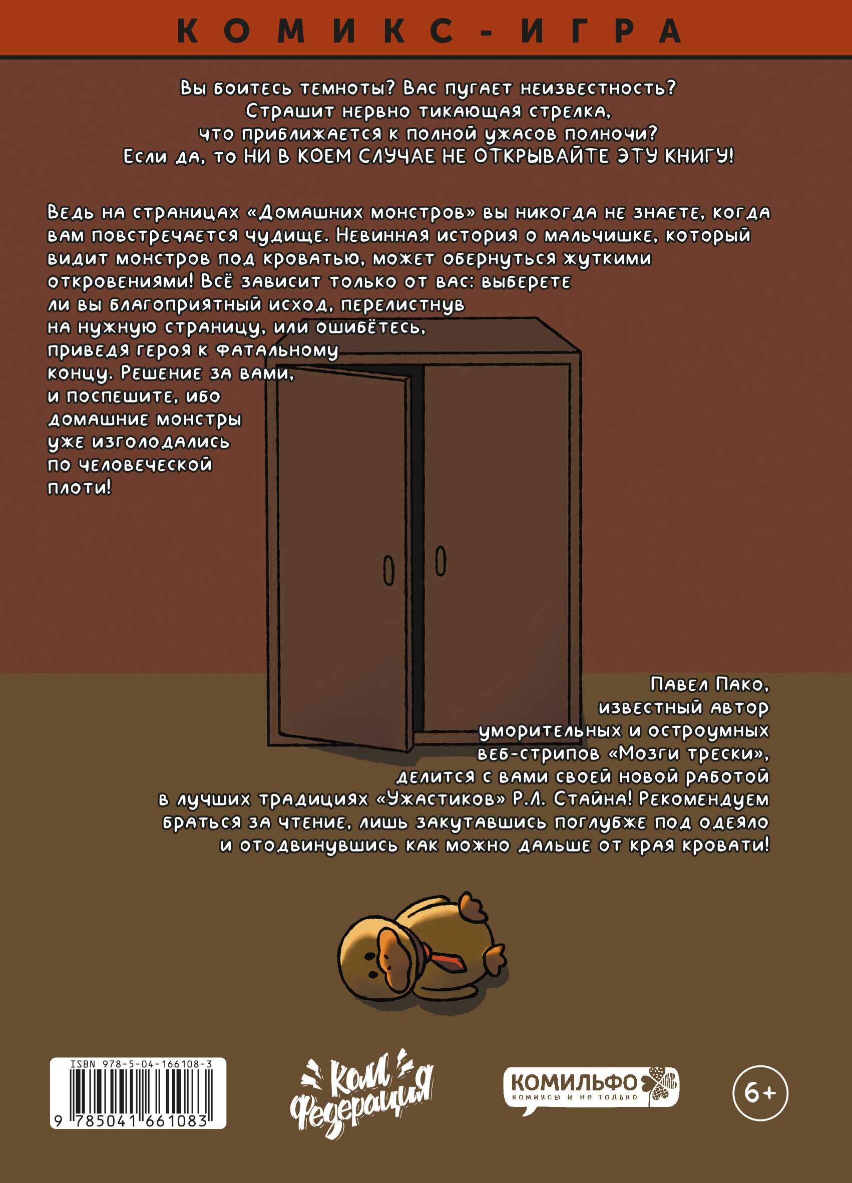 Вы боитесь темноты? Вас пугает неизвестность? Страшит нервно тикающая стрелка, что приближается к полной ужасов полночи? Если да, то НИ В КОЕМ СЛУЧАЕ НЕ ОТКРЫВАЙТЕ ЭТУ КНИГУ! Ведь на страницах «Домашних монстров» вы никогда не знаете, когда вам повстречается чудище. Невинная история о мальчишке, который видит монстров под кроватью, может обернуться жуткими откровениями! Всё зависит только от вас: выберете ли вы благоприятный исход, перелистнув на нужную страницу, или ошибётесь, приведя героя к фатальному концу. Решение за вами, и поспешите, ибо домашние монстры уже изголодались по человеческой плоти! Павел Пако, известный автор уморительных и остроумных веб-стрипов, делится с вами своей новой работой в лучших традициях «Ужастиков» Р.Л. Стайна! Рекомендуем браться за чтение, лишь закутавшись поглубже под одеяло и отодвинувшись как можно дальше от края кровати!| Издательство | Эксмо |