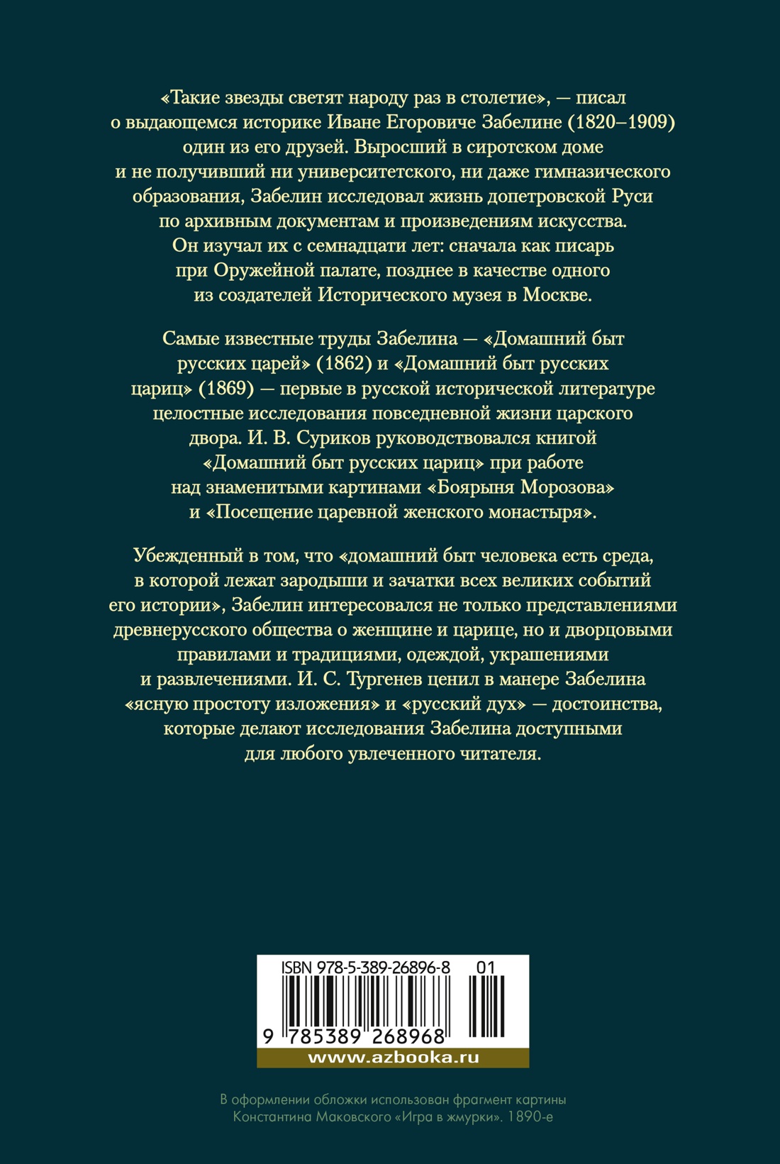 Иван Егорович Забелин (1820-1908) - выдающийся русский историк и археолог. Самые известные труды Забелина - «Домашний быт русских царей» (1862) и «Домашний быт русских цариц» (1869) - первые в русской исторической литературе целостные исследования повседневной жизни царского двора. Убежденный в том, что «домашний быт человека есть среда, в которой лежат зародыши и зачатки всех великих событий его истории», Забелин интересовался не только представлениями древнерусского общества о женщине и царице, но и дворцовыми правилами и традициями, одеждой, украшениями и развлечениями. И. С. Тургенев ценил в манере Забелина «ясную простоту изложения» и «русский дух» - достоинства, которые делают исследования Забелина доступными для любого увлеченного читателя.| Издательство | Азбука |