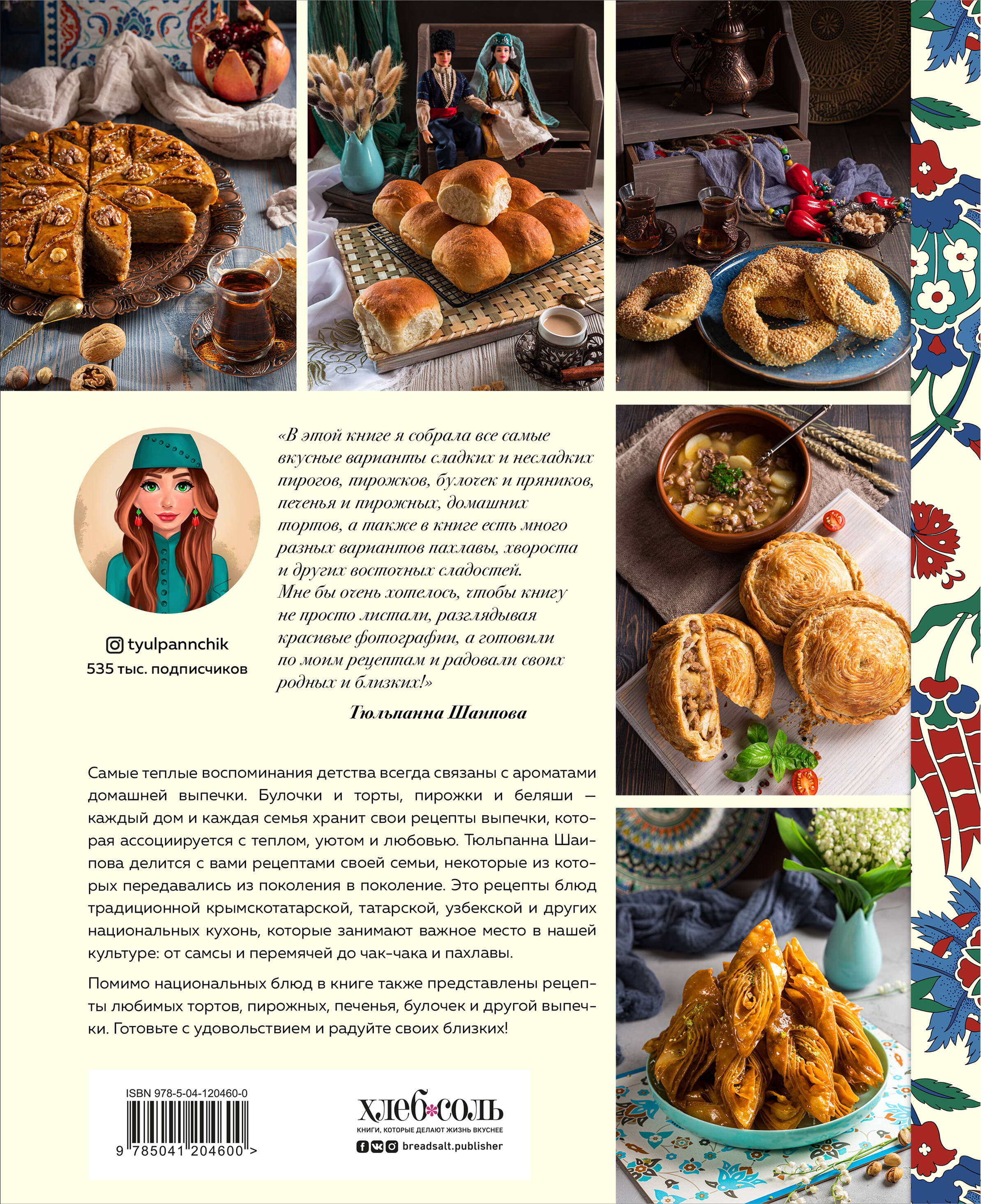 Самые теплые воспоминания детства всегда связаны с ароматами домашней выпечки. Булочки и торты, пирожки и беляши - каждый дом и каждая семья хранит свои рецепты выпечки, которая ассоциируется с теплом, уютом и любовью. Тюльпанна Шаипова делится с вами рецептами своей семьи, некоторые из которых передавались из поколения в поколения. Это рецепты блюд традиционной крымско-татарской, татарской, узбекской и другой кухни, которые занимают важное место в нашей культуре: от самсы и перемячей до чак-чака и пахлавы. Помимо национальных блюд в книге также представлены рецепты любимых тортов, пирожных, печенья, булочек и другой выпечки. Пеките с удовольствием и радуйте своих близких!| Издательство | ООО "Издательство "Эксмо" |