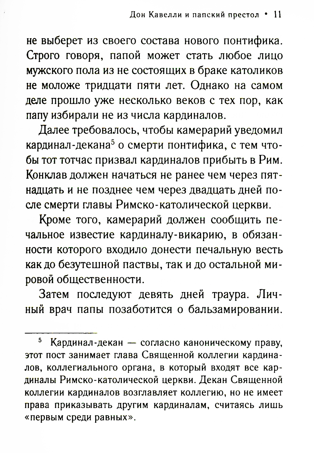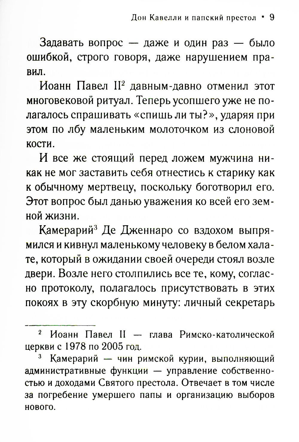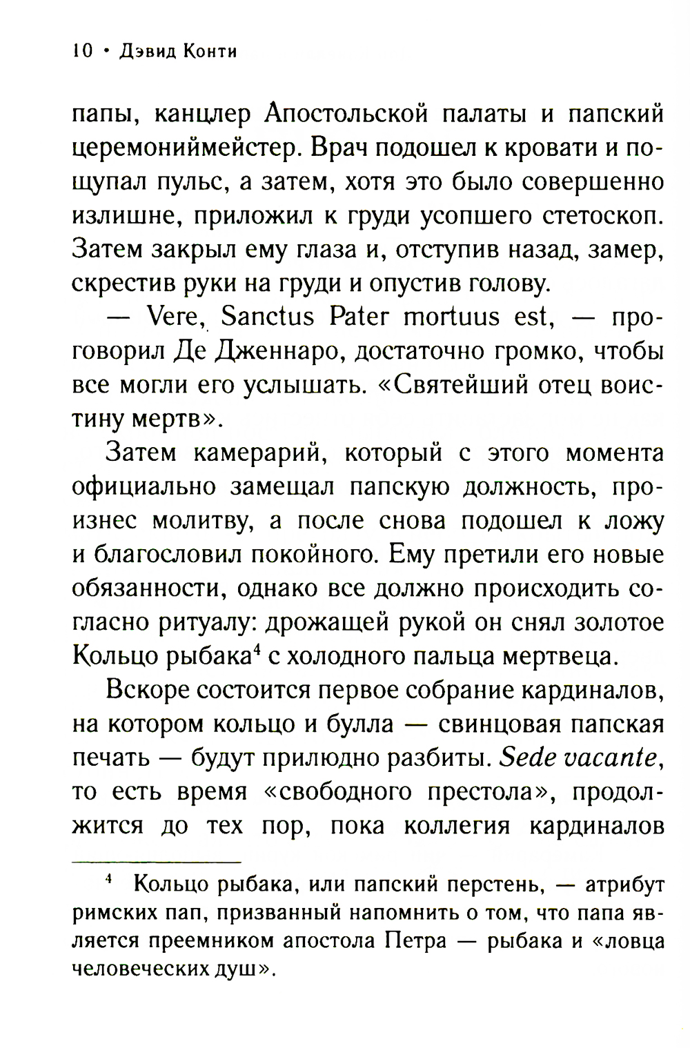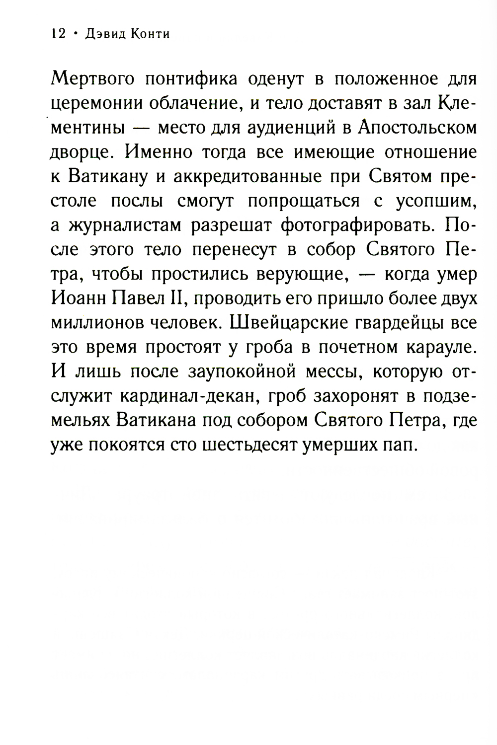 В Ватикане скорбно звонят колокола: умер папа римский, и весь мир замер в ожидании решения кардинальского конклава. Но внезапная череда странных событий - выдвигаемые кандидаты как один отказываются от избрания на пост главы церкви - рождает множество слухов и домыслов. Что это: заговор, предательство? Резидент Ватикана, профессор истории Донато Кавелли склоняется к выводу, что и то и другое. Но его попытки докопаться до истины заканчиваются тем, что за ним начинается настоящая охота. Чтобы отвести нависшую угрозу, Кавелли придется нарушить церковные запреты, рискуя не только собственной репутацией, но и жизнью. Теперь только от него зависит, будет ли новый римский папа последним…| Издательство | Аркадия |