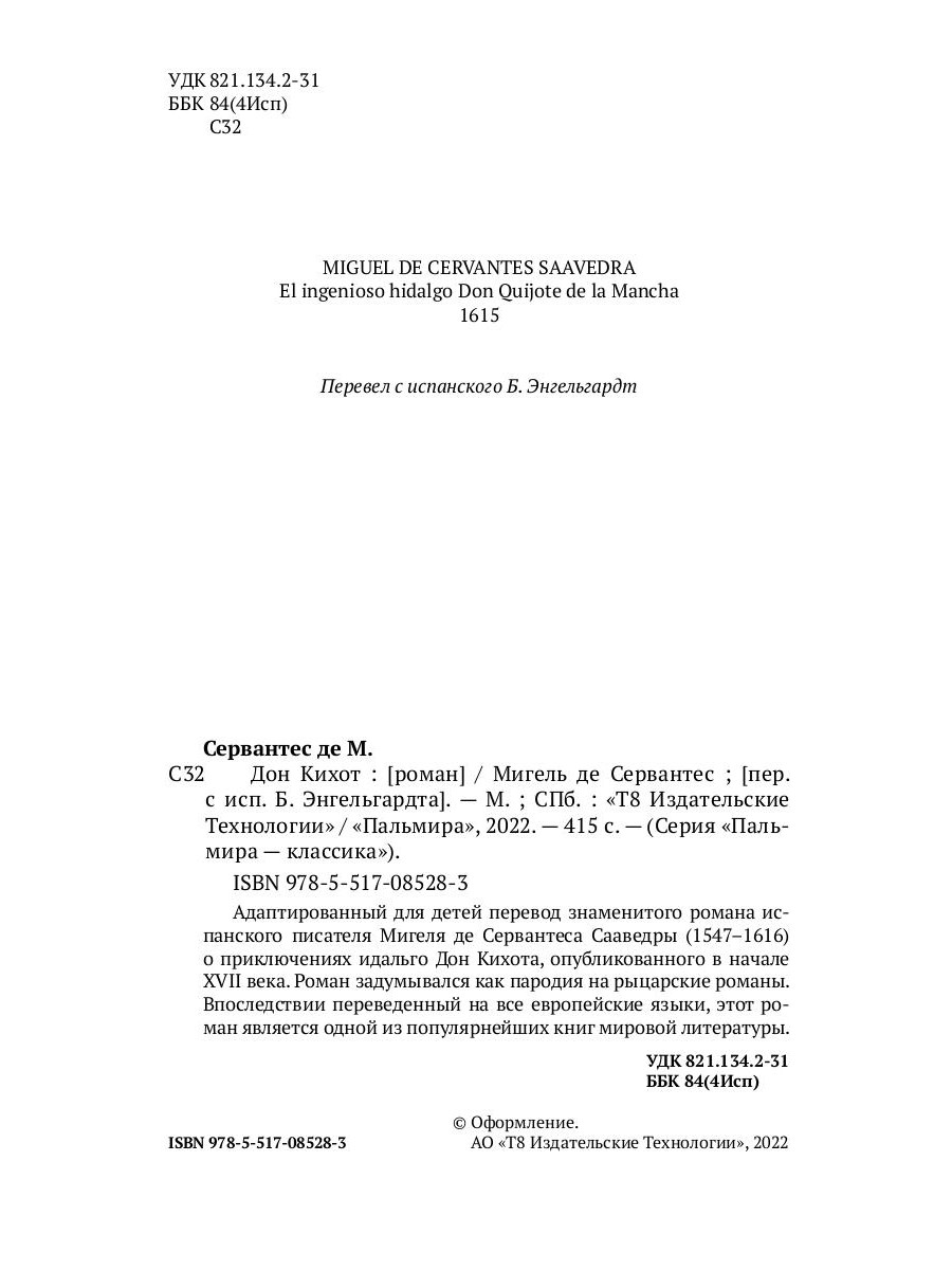 Мигель де Сервантес Сааведра (1547-1616) - знаменитый испанский писатель, известный как автор одного из величайших произведений мировой литературы - романа «Хитроумный идальго Дон Кихот Ламанчский». Роман «Дон Кихот», опубликованный в начале XVII века, задумывался как пародия на рыцарские романы. Впоследствии переведенный на все европейские языки и многократно экранизированный, роман остается одной из популярнейших книг мировой литературы. Роман публикуется в адаптированном для детей переводе Б. М. Энгельгардта.| Издательство | Т8 RUGRAM |