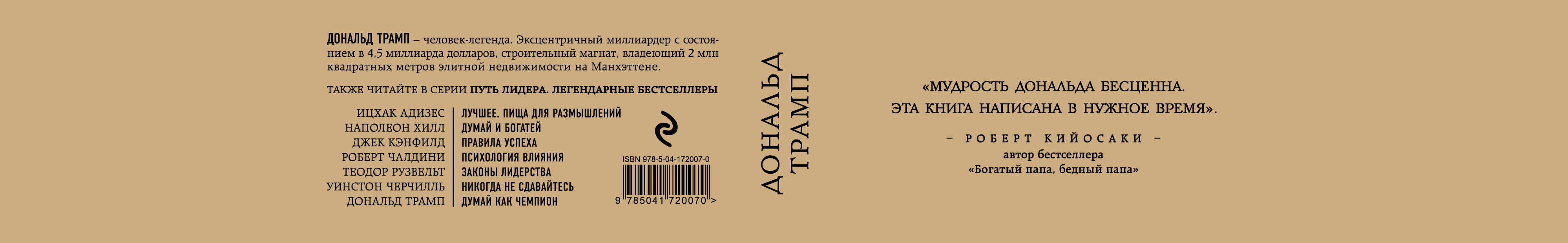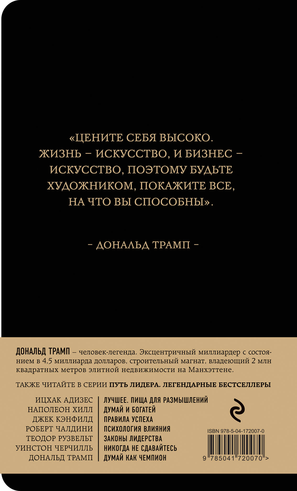ФИШКИ СЕРИИ Книги серии «Путь лидера. Легендарные бестселлеры» роскошно оформлены: переплет из черного бумвинила, тиснение золотом, скругленные углы, стильные красные форзацы и лента-ляссе, качественная белая бумага в блоке. Прекрасный подарок и украшение книжной полки. ТАКЖЕ ЧИТАЙТЕ В СЕРИИ: Ицхак Адизес. «Лучшее. Пища для размышлений» Наполеон Хилл. «Думай и богатей» Джек Кэнфилд. «Правила успеха» Роберт Чалдини. «Психология влияния» Теодор Рузвельт. «Законы лидерства» Уинстон Черчилль. «Никогда не сдавайтесь» Дональд Трамп. «Думай как чемпион» ПРАВИЛА ТРАМПА: В бизнесе лучше быть дерзким, чем несговорчивым. Самое худшее, что может сделать бизнесмен, проворачивающий сделку, - это позволить партнерам почувствовать, как сильно он желает этого. Не стесняйтесь торговаться, добиваясь для себя более выгодных условий. Я считаю гордость, которая мешает экономить собственные деньги, огромной глупостью. Цените себя высоко. Жизнь - искусство, и бизнес - искусство, поэтому будьте художником, покажите все, на что вы способны. Относитесь к себе, как к корпорации. Уделяйте внимание всем без исключения сторонам своей жизни. Приспосабливайтесь, или проиграете. ДЛЯ КОГО ЭТА КНИГА Для руководителей компаний и подразделений, для тех, кто интересуется вопросами лидерства, историей XX века. ФИШКИ КНИГИ Предисловие к книге написал Роберт Кийосаки, автор сенсационного бестселлера «Богатый папа, бедный папа». ОТЗЫВЫ О КНИГЕ «Мудрость Дональда бесценна. Эта книга написана в нужное время». - Роберт Кийосаки, автор бестселлера «Богатый папа, бедный папа»| Издательство | ООО "Издательство "Эксмо" |