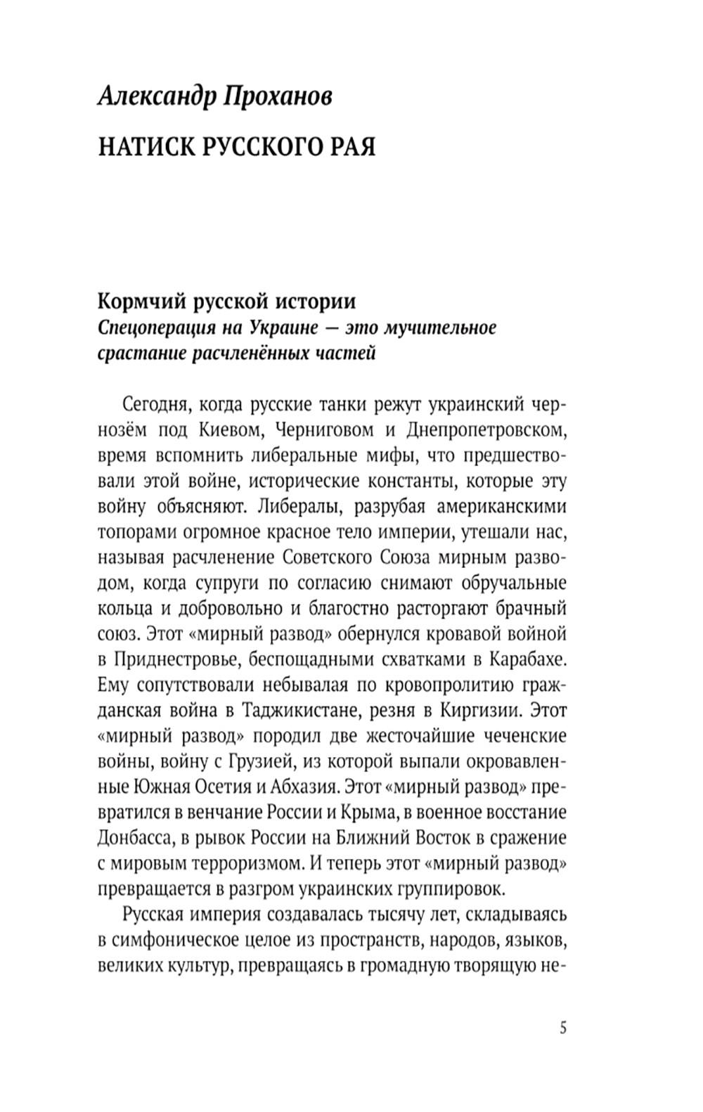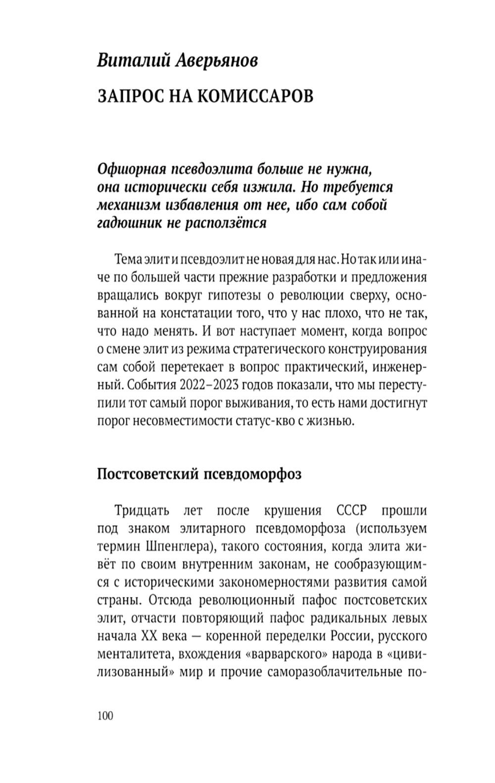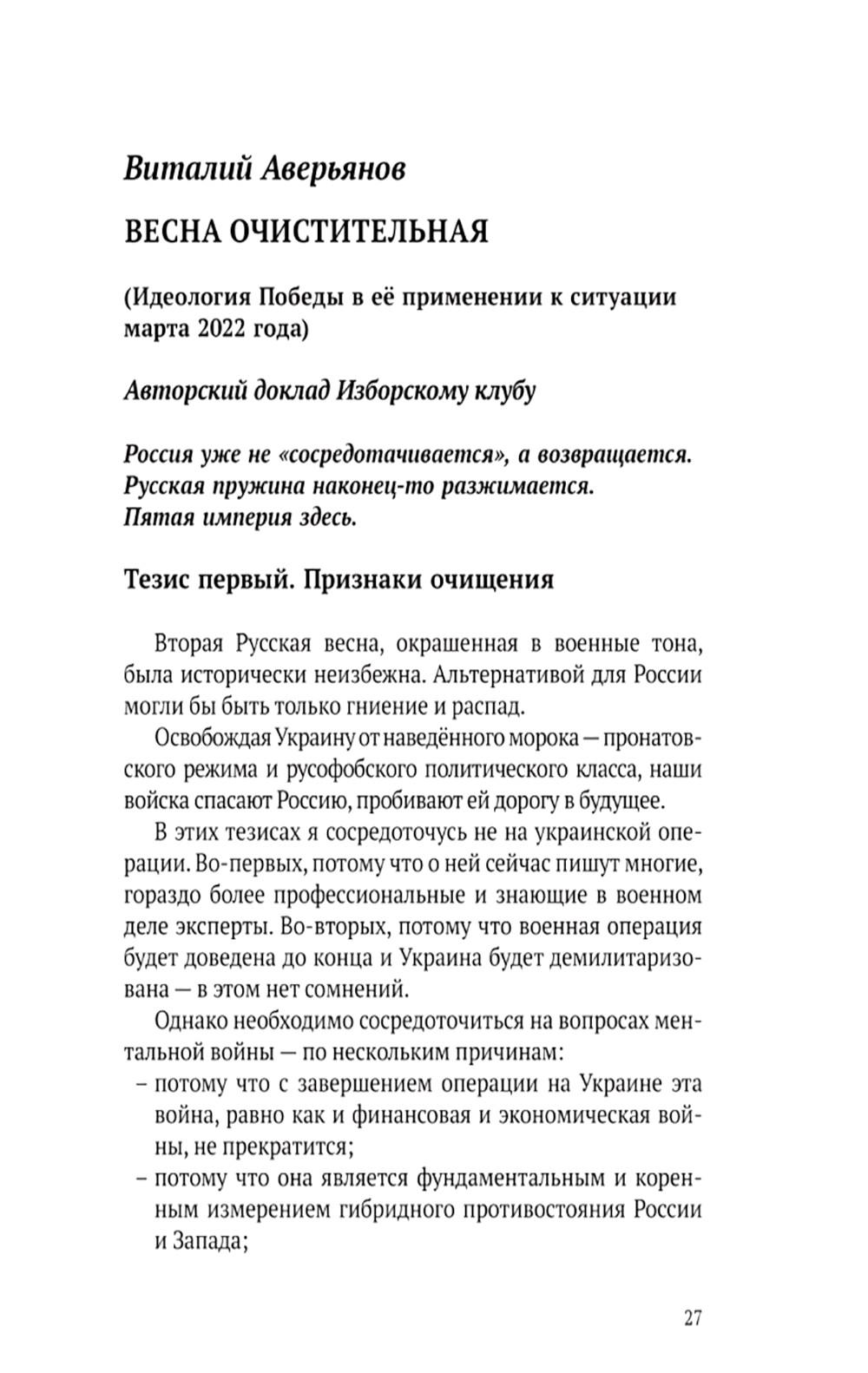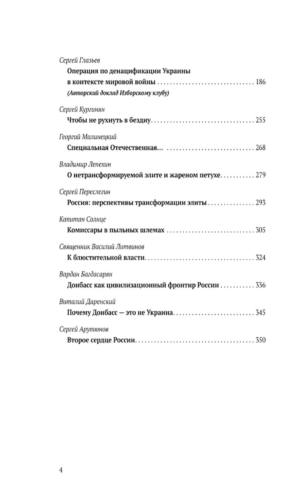 Изменения, которые произошли после 24 февраля 2022 года, носят эпохальный и глобальный характер. СВО - это не просто операция по возвращению Украины в лоно Русского мира. Это веха, которая обозначила разворот России к самой себе, к собственной цивилизационной сущности. Поэтому речь идет не просто о Русской весне как эпизоде, но о новом, имеющем неповторимое лицо периоде русской истории - донбасском. Разворот России к себе сделал неразрывными две важнейшие и острейшие проблемы: защиту суверенности Русской цивилизации и смену, обновление элит, или, иными словами, кадровую революцию, необходимость в которой явственно встала перед Россией в эти годы. Члены и эксперты Изборского клуба осуществляют всестороннее рассмотрение двух этих проблем, говоря о революции сверху, социальной базой которой оказывается, по сути, вся страна. СВО рассматривается как часть мировой гибридной войны, её ведут против нас транснациональные элиты Запада. Разбирается феномен либерал-фашизма, процветающего в нынешней Украине, причём именно как часть всемирного антисистемного проекта, а не просто как экзотическая локальная этнократия, бандеровщина и т. п. Говорится о необходимости мощной идеологической мобилизации, прогнозируются и варианты развития событий после победы в СВО, намечаются необходимые модели последующего существования, рассматривается влияние донбасского фактора на будущее украинских земель. Подробно исследуется место Донбасса в процессе имперской реинтеграции, при этом Донбасс характеризуется как цивилизационный фронтир. Говорится о важнейшей исторической роли донбасского региона, чья история тесно связана с образованием и утверждением Древнерусского государства (Донецкая Русь). Предлагается создание новых структур, которые будут способствовать победному развёртыванию России (Спецкомитет-2, Идеологический штаб и др.). Намечается комплекс разнообразных финансово-экономических мер, позволяющих России противостоять давлению Запада. Часть представленных работ написана в первой половине 2022 года, ещё до того, как произошли определённые знаковые события. Однако это нисколько не умаляет актуальности написанного.| Издательство | Наше Завтра |