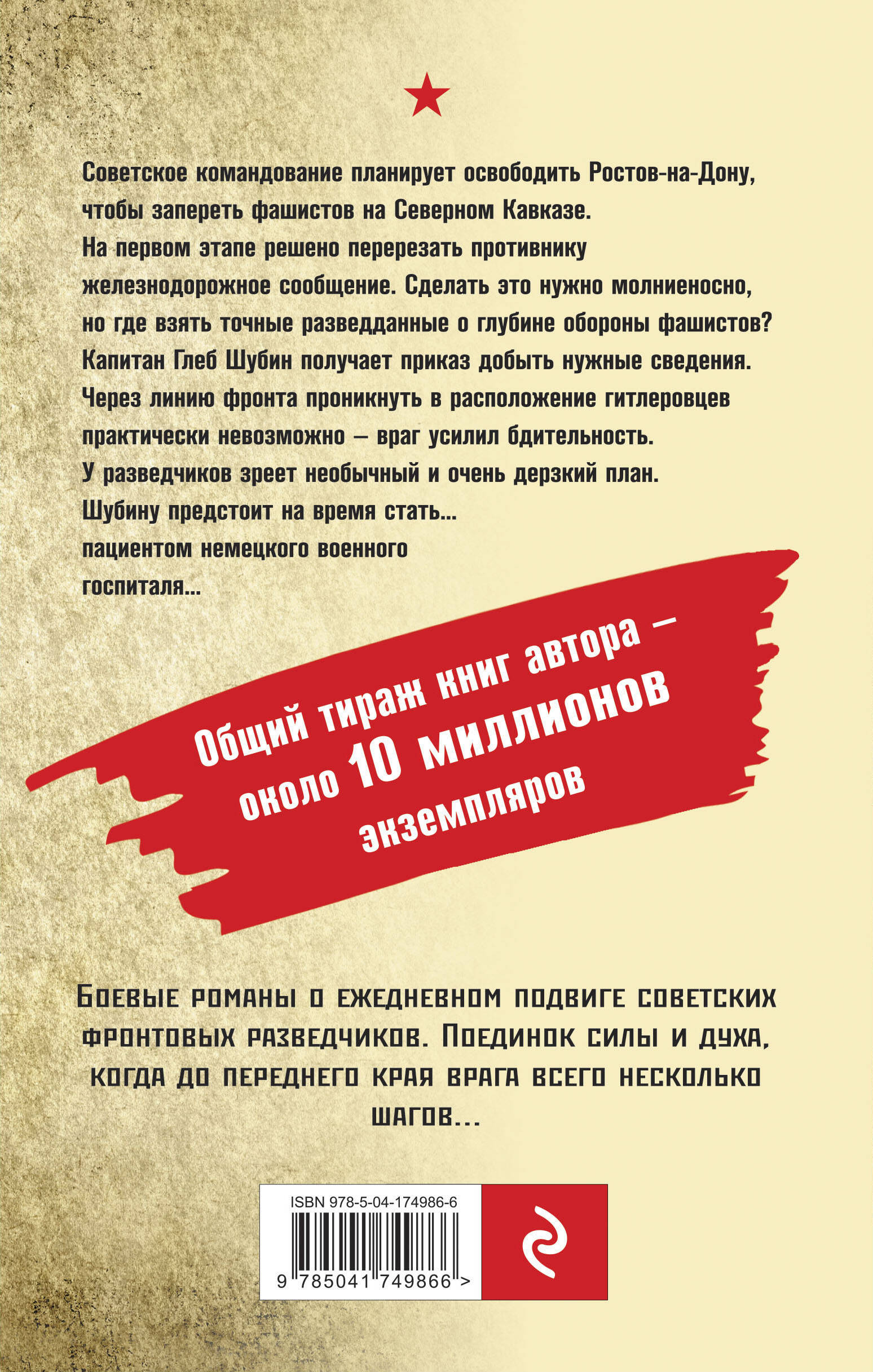 Боевые романы о ежедневном подвиге советских фронтовых разведчиков. Поединок силы и духа, когда до переднего края врага всего несколько шагов. Подробности жестоких боев, о которых не рассказывают даже ветераны - участники тех событий. Советское командование планирует освободить Ростов-на-Дону, чтобы запереть фашистов на Северном Кавказе. На первом этапе решено перерезать противнику железнодорожное сообщение. Сделать это нужно молниеносно, но где взять точные разведданные о глубине обороны фашистов? Капитан Глеб Шубин получает приказ добыть нужные сведения. Через линию фронта проникнуть в расположение гитлеровцев практически невозможно - враг усилил бдительность. У разведчиков зреет необычный и очень дерзкий план. Шубину предстоит на время стать… пациентом немецкого военного госпиталя… Общий тираж книг автора - более 10 миллионов экземпляров.| Издательство | ООО "Издательство "Эксмо" |