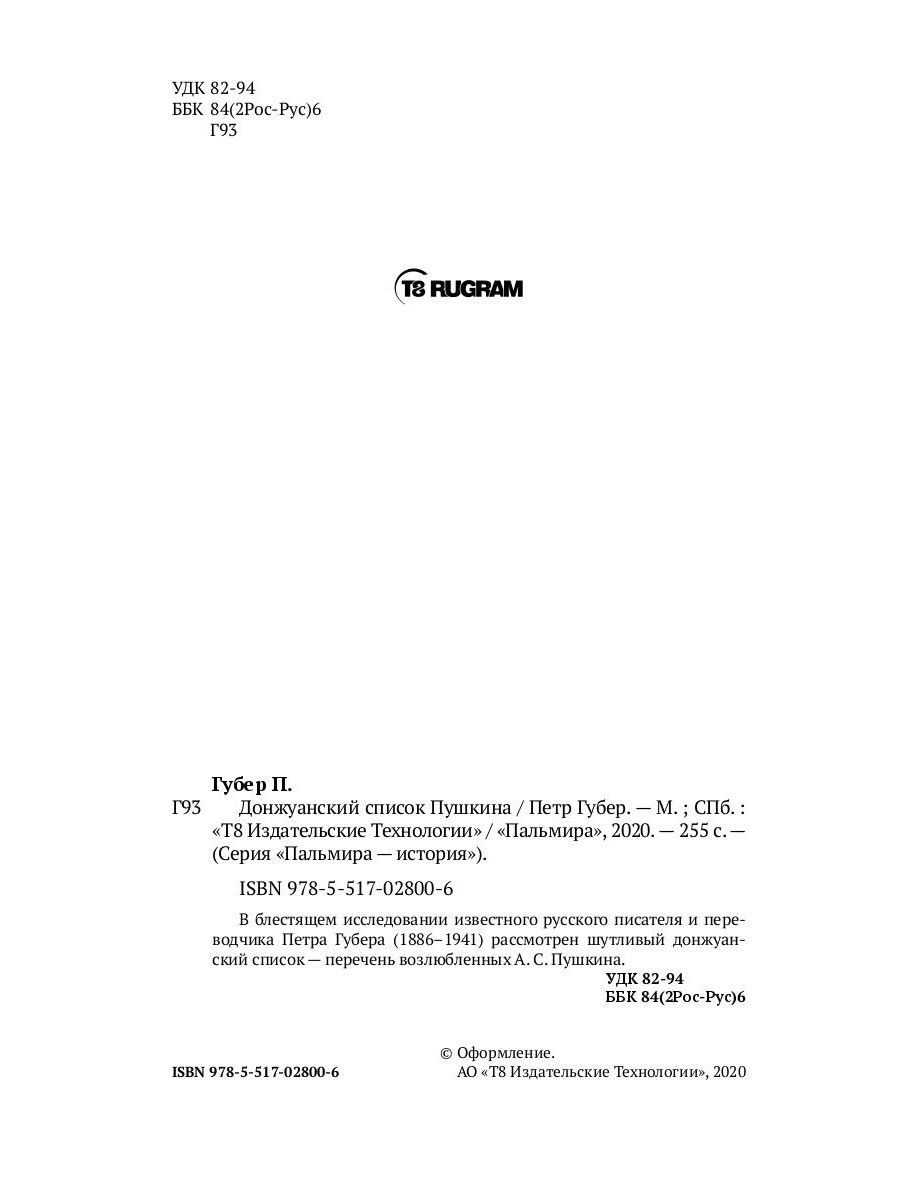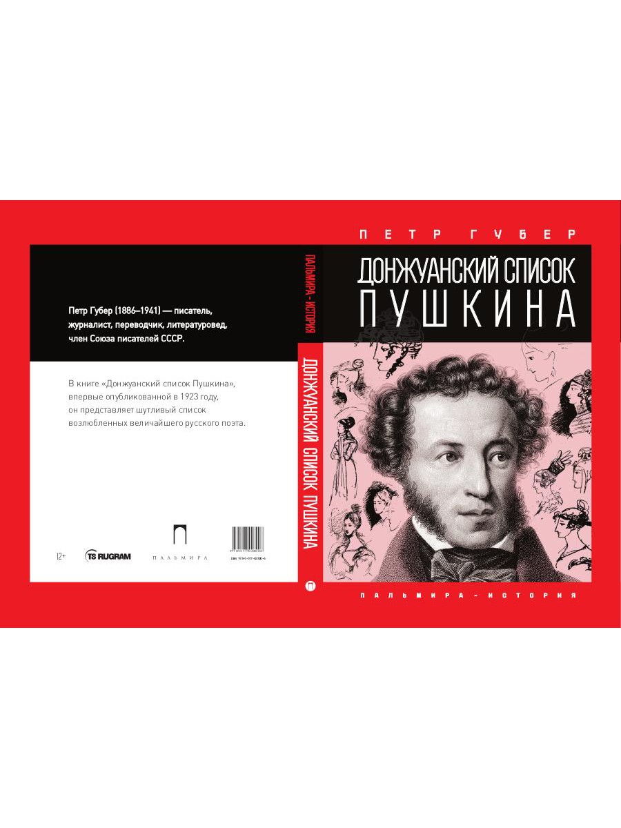 В блестящем исследовании известного русского писателя и переводчика Петра Губера (1886-1941) рассмотрен шутливый донжуанский список - перечень возлюбленных А. С. Пушкина.| Издательство | Т8 RUGRAM |