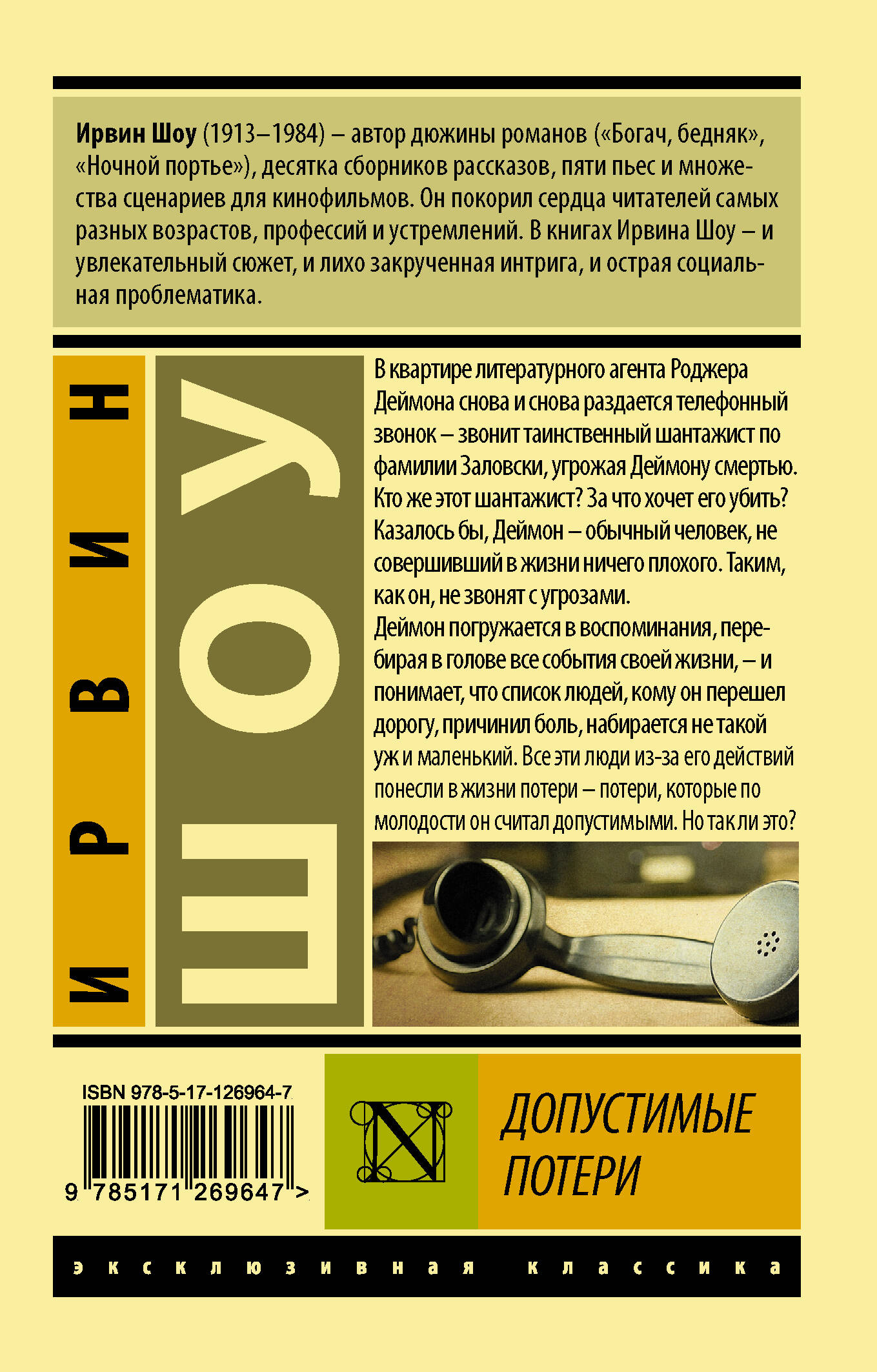 В квартире литературного агента Роджера Деймона снова и снова раздается телефонный звонок - звонит таинственный шантажист по фамилии Заловски, угрожая Деймону смертью. Кто же этот шантажист? За что хочет его убить? Казалось бы, Деймон - обычный человек, не совершивший в жизни ничего плохого. Таким, как он, не звонят с угрозами. Деймон погружается в воспоминания, перебирая в голове все события своей жизни, - и понимает, что список людей, кому он перешел дорогу, причинил боль, набирается не такой уж и маленький. Все эти люди из-за его действий понесли в жизни потери - потери, которые по молодости он считал допустимыми. Но так ли это?| Издательство | ИЗДАТЕЛЬСТВО "АСТ" |