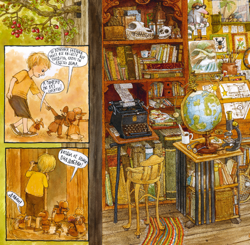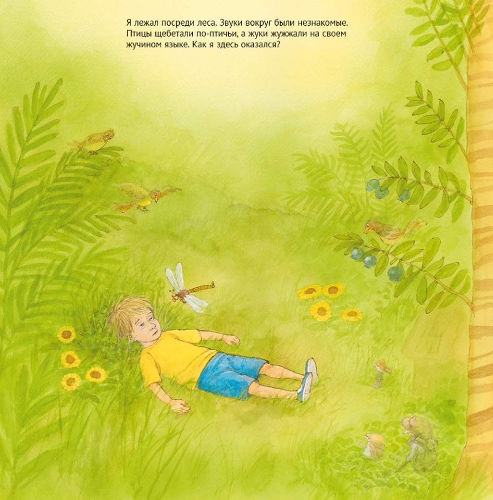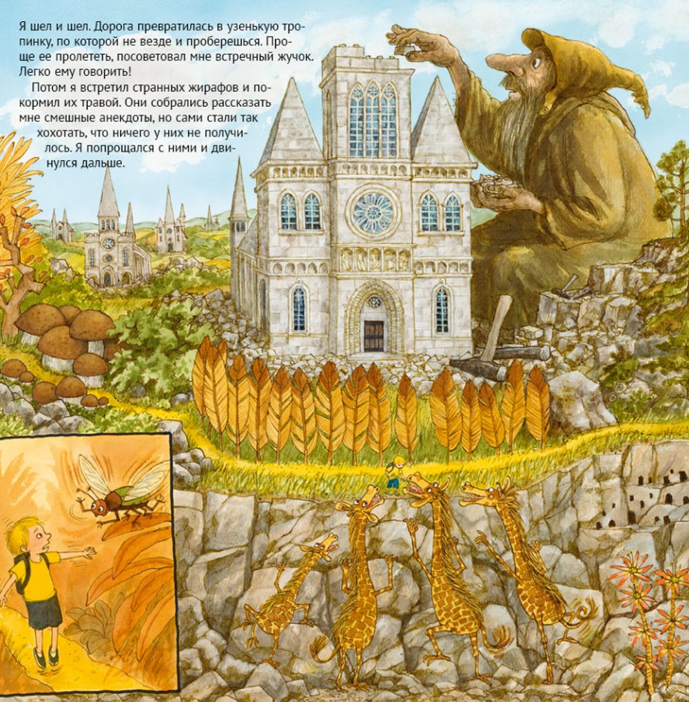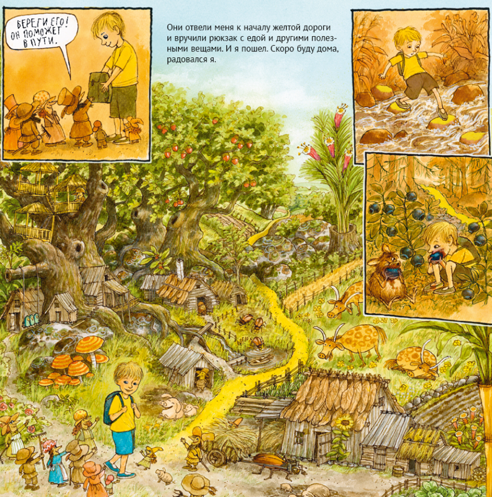 Мальчик очутился в незнакомом месте и не понимает, ни как сюда попал, ни как вернуться назад. Но на подмогу приходят маленькие человечки и Справочная бабушка. Важно все время следовать за желтой полоской: она обязательно выведет к дому. Желтая дорога вьется между скал, где странные жирафы травят анекдоты, ныряет в лес, населенный добрыми троллями, приводит в пустыню, уставленную кораблями и лодками, и превращается в желтую реку - а дальше и море, и остров, и замок принцессы, и лабиринт. На каждом повороте мальчика поджидают не только опасности, но и добрые помощники - то хулиганистые галки, то суровый капитан подводной лодки, то говорящий пес, то художница, рисующая волшебные картины. А в случае чего выручает подаренный человечками необыкновенный рюкзак.