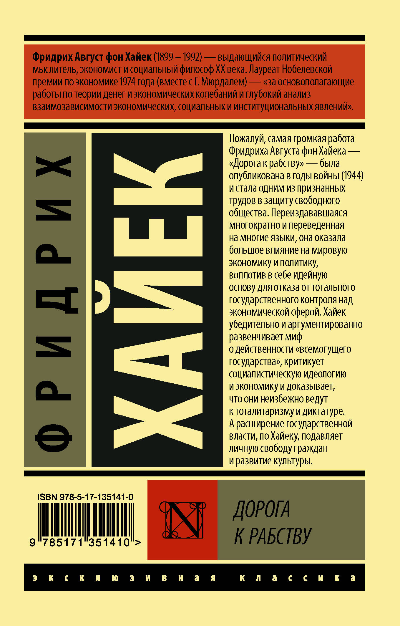 Пожалуй, самая громкая работа Фридриха Августа фон Хайека - "Дорога к рабству" - была опубликована в годы войны (1944) и стала одним из признанных трудов в защиту свободного общества. Многократно переиздававшая и переведенная на многие языки, она оказала большое влияние на мировую экономику и политику, воплотив в себе идейную основу для отказа от тотального государственного контроля над экономической сферой. Хайек убедительно и аргументированно развенчивает миф о действенности "всемогущего государства", критикует социалистическую идеологию и экономику и доказывает, что они неизбежно ведут к тоталитаризму и диктатуре. А расширение государственной власти, по Хайеку, подавляет личную свободу граждан и развитие культуры.| Издательство | ИЗДАТЕЛЬСТВО "АСТ" |