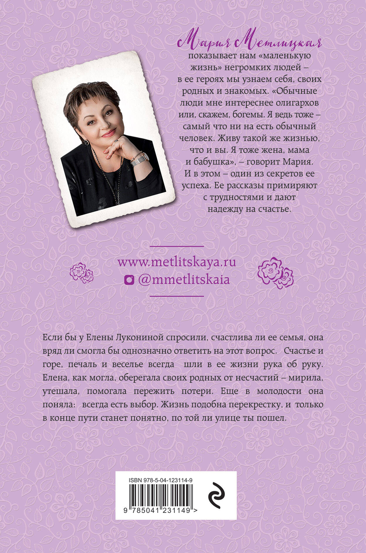 Если бы у Елены Лукониной спросили, счастлива ли ее семья, она вряд ли смогла бы однозначно ответить на этот вопрос. Счастье и горе, печаль и веселье всегда шли в ее жизни рука об руку. Елена, как могла, оберегала своих родных от несчастий - мирила, утешала, помогала пережить потери. Еще в молодости она поняла: всегда есть выбор. Жизнь подобна перекрестку, и только в конце пути станет понятно, по той ли улице ты пошел. Совокупный тираж книг Марии Метлицкой сегодня - около 3 млн экземпляров. Читатели ценят ее особую интонацию, особую задушевную манеру. Прозу Марии Метлицкой по праву называют психотерапевтической.| Издательство | ООО "Издательство "Эксмо" |