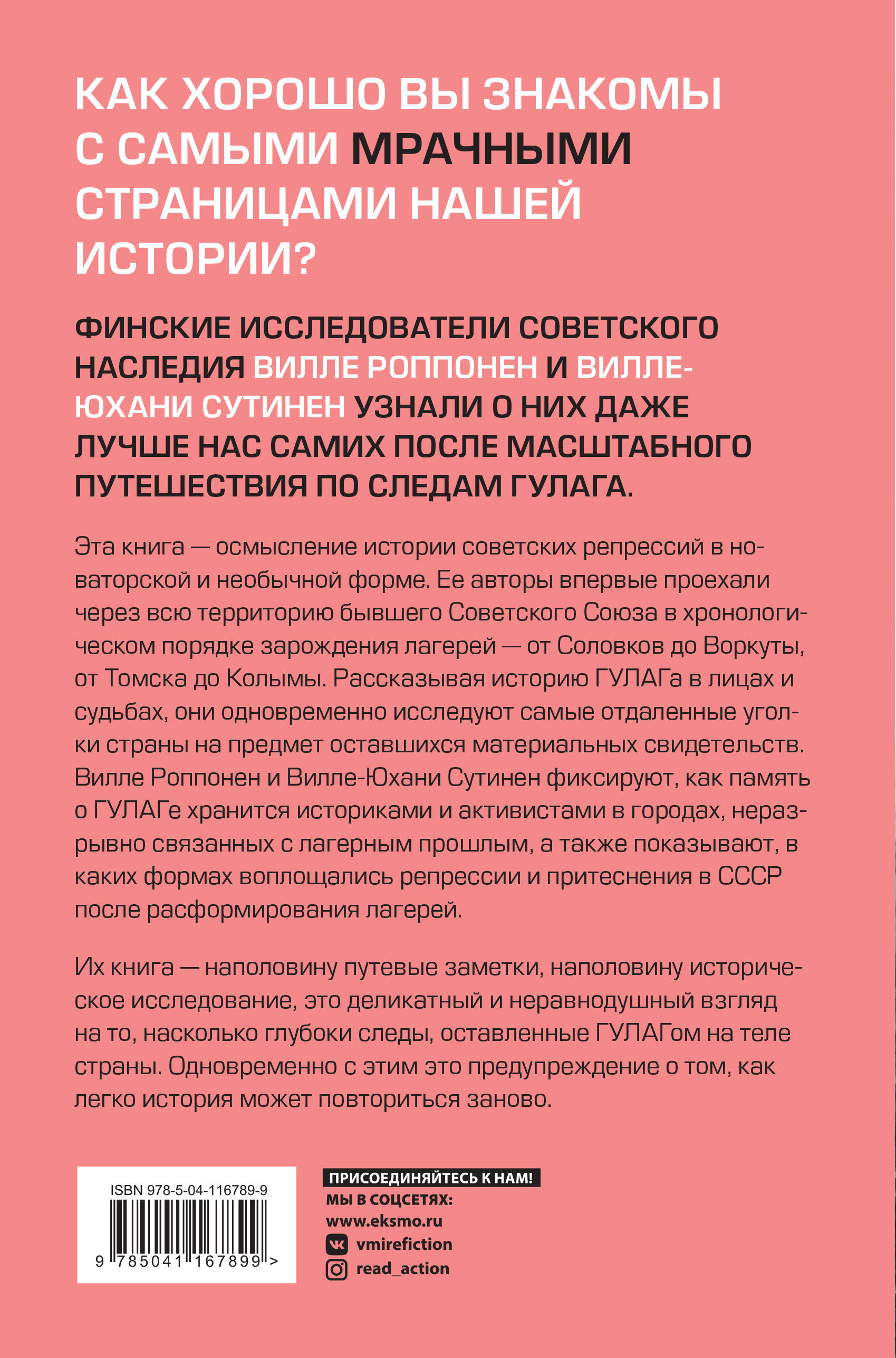 ЛУЧШИЙ ФИНСКИЙ НОН-ФИКШН 2019 ГОДА. ЛАУРЕАТ ПРЕМИИ TIETO-FINLANDIA. Как хорошо вы знакомы с самыми мрачными страницами нашей истории? Финские исследователи советской истории Вилле Роппонен и Вилле-Юхани Сутинен знают о них даже лучше нас самих, отправившись в масштабное путешествие по следам ГУЛАГа. Проехав через всю территорию бывшего Советского Союза в хронологическом порядке зарождения лагерей - от Соловков до Воркуты, от Томска до Колымы, - они рассказывают историю становления тоталитарной машины и показывают, как воспринимается память о репрессиях сегодня. Исследование заброшенных остатков лагерей, визиты в провинциальные музеи, посещение мемориалов и кладбищ, беседы с местными жителями, историками и хранителями памяти, исторические факты и мемуары свидетелей эпохи сплетаются в уникальное и всеобъемлющее путешествие по истории советского террора. Глава за главой, через живые истории людей, авторы показывают, что репрессии простираются далеко за пределы 1930-х годов и не закончились с «оттепелью», а лишь сменили форму, и что даже сегодня советское наследие не преодолено до конца. Их книга - наполовину путевые заметки, наполовину историческое исследование - это деликатный и неравнодушный взгляд на то, насколько глубоки следы, оставленные ГУЛАГом на теле страны. Одновременно с этим - это напоминание о том, как легко история может повториться заново.