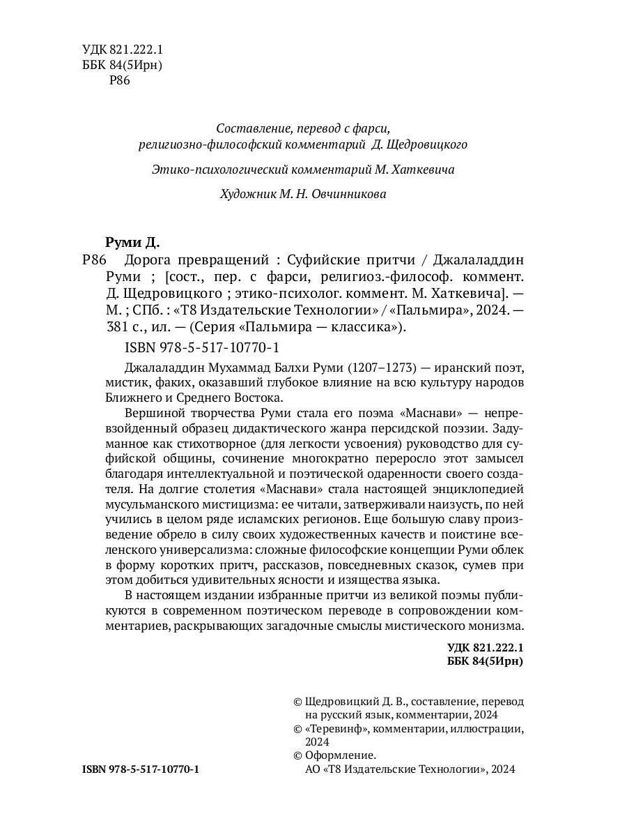 Джалаладдин Мухаммад Балхи Руми (1207-1273) - иранский поэт, мистик, факих, оказавший глубокое влияние на всю культуру народов Ближнего и Среднего Востока. Вершиной творчества Руми стала его поэма «Маснави» - непревзойденный образец дидактического жанра персидской поэзии. Задуманное как стихотворное (для легкости усвоения) руководство для суфийской общины, сочинение многократно переросло этот замысел благодаря интеллектуальной и поэтической одаренности своего создателя. На долгие столетия «Маснави» стала настоящей энциклопедией мусульманского мистицизма: ее читали, затверживали наизусть, по ней учились в целом ряде исламских регионов. Еще большую славу произведение обрело в силу своих художественных качеств и поистине вселенского универсализма: сложные философские концепции Руми облек в форму коротких притч, рассказов, повседневных сказок, сумев при этом добиться удивительных ясности и изящества языка. В настоящем издании избранные притчи из великой поэмы публикуюется в современном поэтическом переводе в сопровождении комментариев, раскрывающих загадочные смыслы мистического монизма.| Издательство | Т8 RUGRAM |