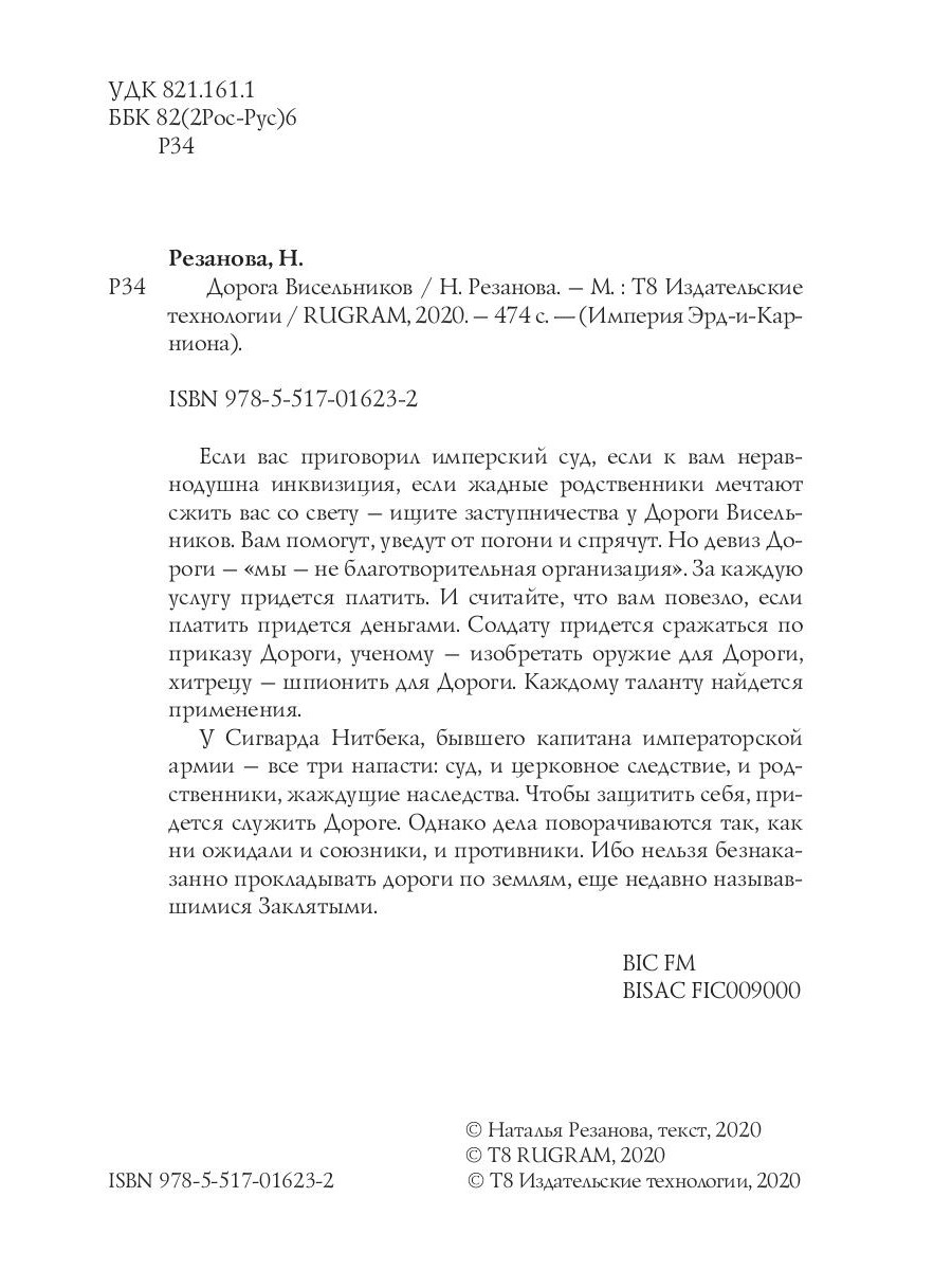 Если вас приговорил имперский суд, если к вам неравнодушна инквизиция, если жадные родственники мечтают сжить вас со свету - ищите заступничества у Дороги Висельников. Вам помогут, уведут от погони и спрячут. Но девиз Дороги - «мы - не благотворительная организация». За каждую услугу придется платить. И считайте, что вам повезло, если платить придется деньгами. Солдату придется сражаться по приказу Дороги, ученому - изобретать оружие для Дороги, хитрецу - шпионить для Дороги. Каждому таланту найдется применения. У Сигварда Нитбека, бывшего капитана императорской армии - все три напасти: суд, и церковное следствие, и родственники, жаждущие наследства. Чтобы защитить себя, придется служить Дороге. Однако дела поворачиваются так, как ни ожидали и союзники, и противники. Ибо нельзя безнаказанно прокладывать дороги по землям, еще недавно называвшимися Заклятыми.| Издательство | Т8 RUGRAM |