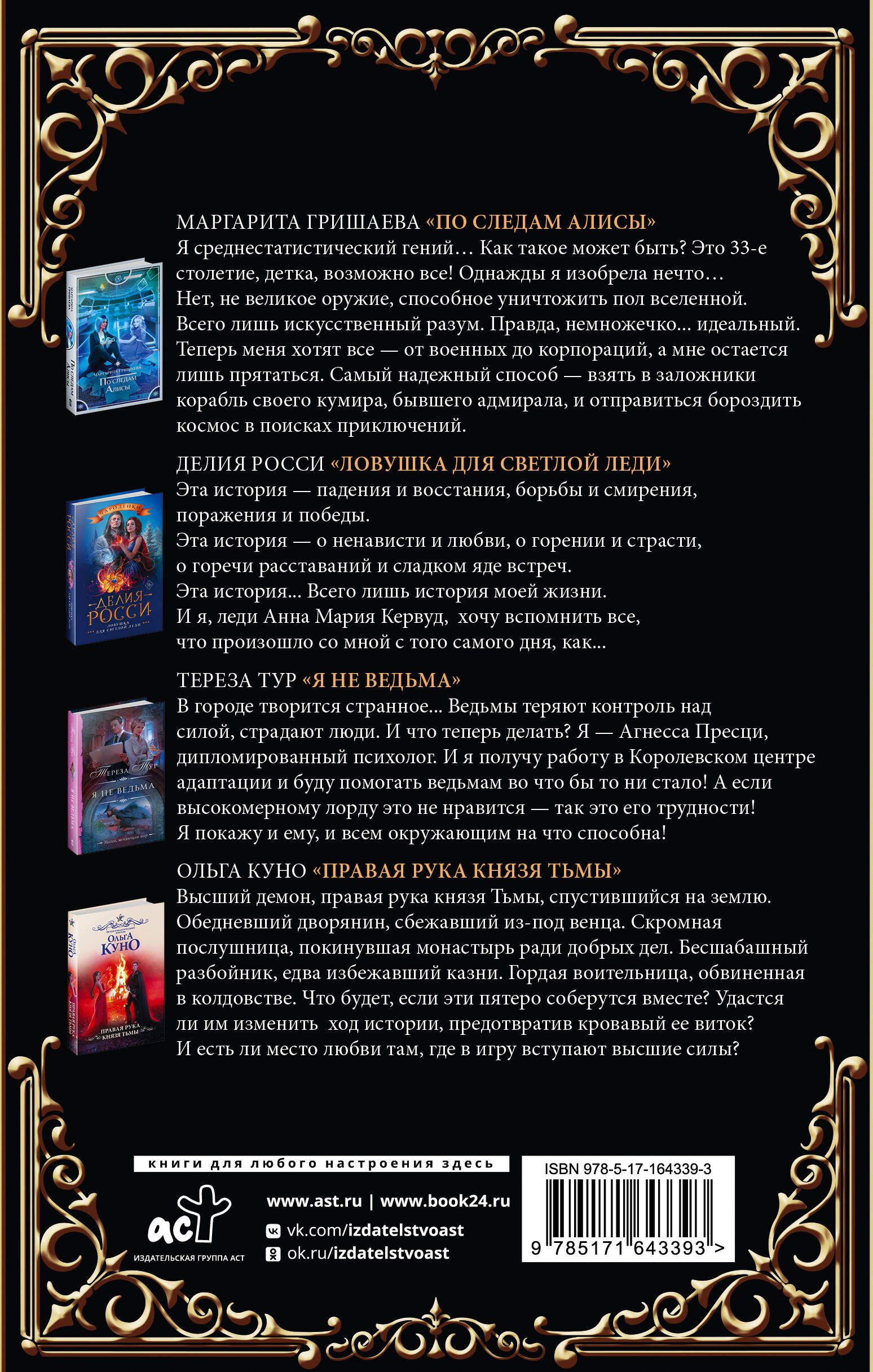 Комплект из 4 книг: Маргарита Гришаева "По следам Алисы" Я среднестатистический гений… Как такое может быть? Это 33-е столетие, детка, возможно все! Однажды я изобрела нечто… Нет, не великое оружие, способное уничтожить пол вселенной. Всего лишь искусственный разум. Правда, немножечко... идеальный. Теперь меня хотят все - от военных до корпораций, а мне остается прятаться от назойливого внимания и первых, и вторых. Самый надежный способ - взять в заложники корабль своего кумира, бывшего адмирала, и отправиться бороздить космос в поисках приключений. Делия Росси "Ловушка для светлой леди" Эта история - падения и восстания, борьбы и смирения, поражения и победы. Эта история - о ненависти и любви, о горении и страсти, о горечи расставаний и сладком яде встреч. Эта история... Всего лишь история моей жизни. И я, леди Анна Мария Кервуд, хочу вспомнить все, что произошло со мной с того самого дня, как... Тереза Тур "Я не ведьма" В городе творится странное... Ведьмы теряют контроль над силой, страдают люди. И что теперь делать? Я - Агнесса Пресци, дипломированный психолог. И я получу работу в Королевском центре адаптации и буду помогать ведьмам во что бы то ни стало! А если высокомерному лорду это не нравится - так это его трудности! Я докажу и ему, и всем окружающим на что способна! Ольга Куно "Правая рука князя Тьмы" Высший демон, правая рука князя Тьмы, спустившийся на землю. Обедневший дворянин, сбежавший из-под венца. Скромная послушница, покинувшая монастырь ради добрых дел. Бесшабашный разбойник, едва избежавший казни. Гордая воительница, обвиненная в колдовстве. Что будет, если эти пятеро соберутся вместе? Удастся ли им изменить ход истории, предотвратив кровавый ее виток? И есть ли место любви там, где в игру вступают высшие силы?| Издательство | Издательство "АСТ" |