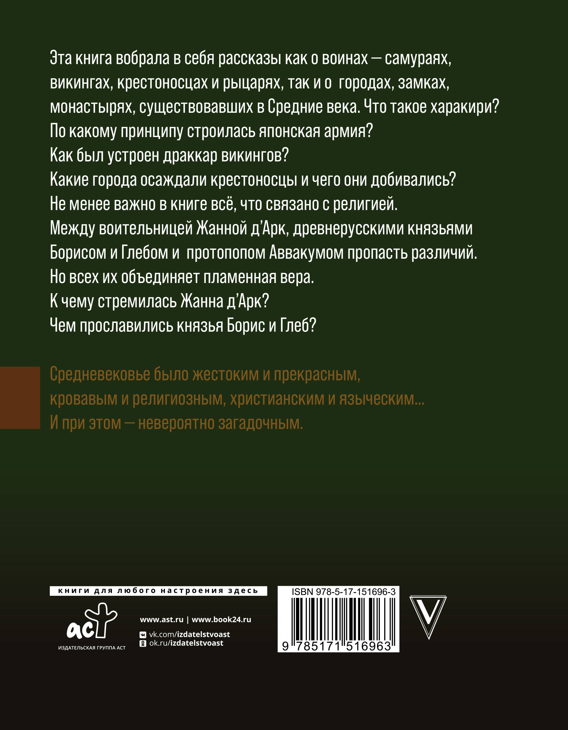 НАСТОЯЩИЙ МАТЕРИАЛ (ИНФОРМАЦИЯ) ПРОИЗВЕДЕН И РАСПРОСТРАНЕН ИНОСТРАННЫМ АГЕНТОМ ЭЙДЕЛЬМАН ТАМАРОЙ НАТАНОВНОЙ ЛИБО КАСАЕТСЯ ДЕЯТЕЛЬНОСТИ ИНОСТРАННОГО АГЕНТА ЭЙДЕЛЬМАН ТАМАРЫ НАТАНОВНЫ Эта книга вобрала в себя рассказы как о воинах - самураях, викингах, крестоносцах и рыцарях, так и о городах, замках, монастырях, существовавших в Средние века. Что такое харакири? По какому принципу строилась японская армия? Как был устроен драккар викингов? Какие города осаждали крестоносцы и чего они добивались? Не менее важно в книге всё, что связано с религией. Между воительницей Жанной д'Арк, древнерусскими князьями Борисом и Глебом, и протопопом Аввакумом - пропасть различий. Но всех их объединяет пламенная вера. К чему стремилась Жанна д'Арк? Чем прославились князья Борис и Глеб? Средневековье было жестоким и прекрасным, кровавым и религиозным, христианским и языческим… И при этом - невероятно загадочным.| Издательство | Издательство "АСТ" |