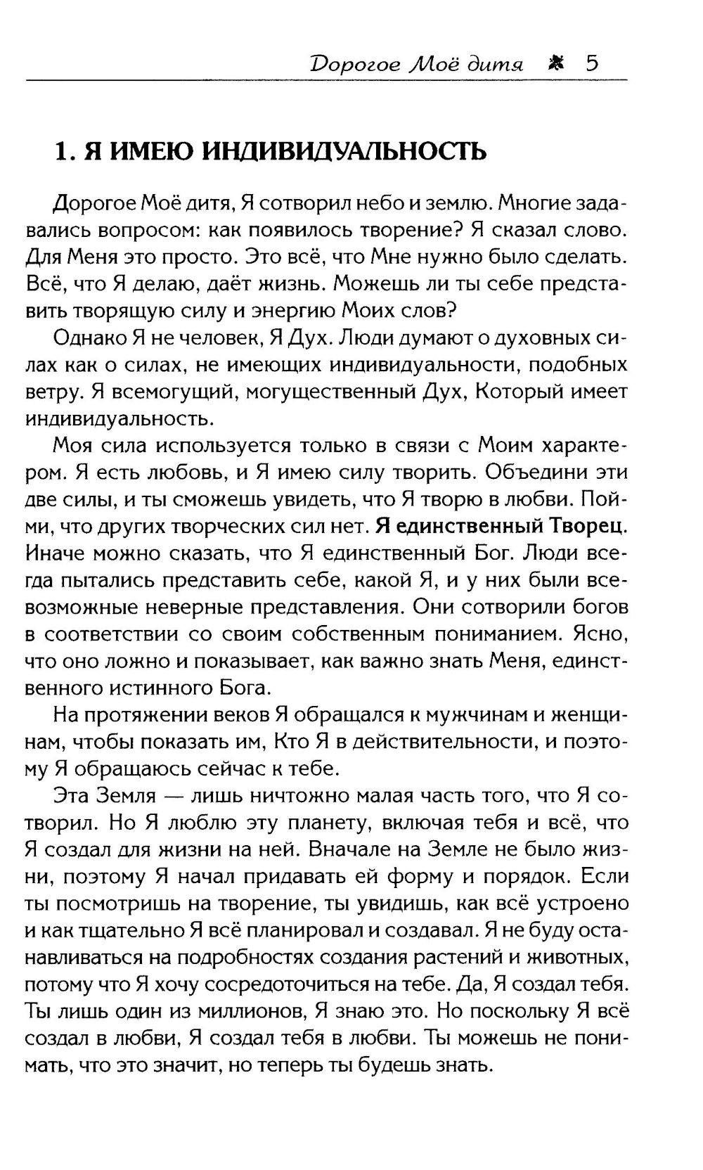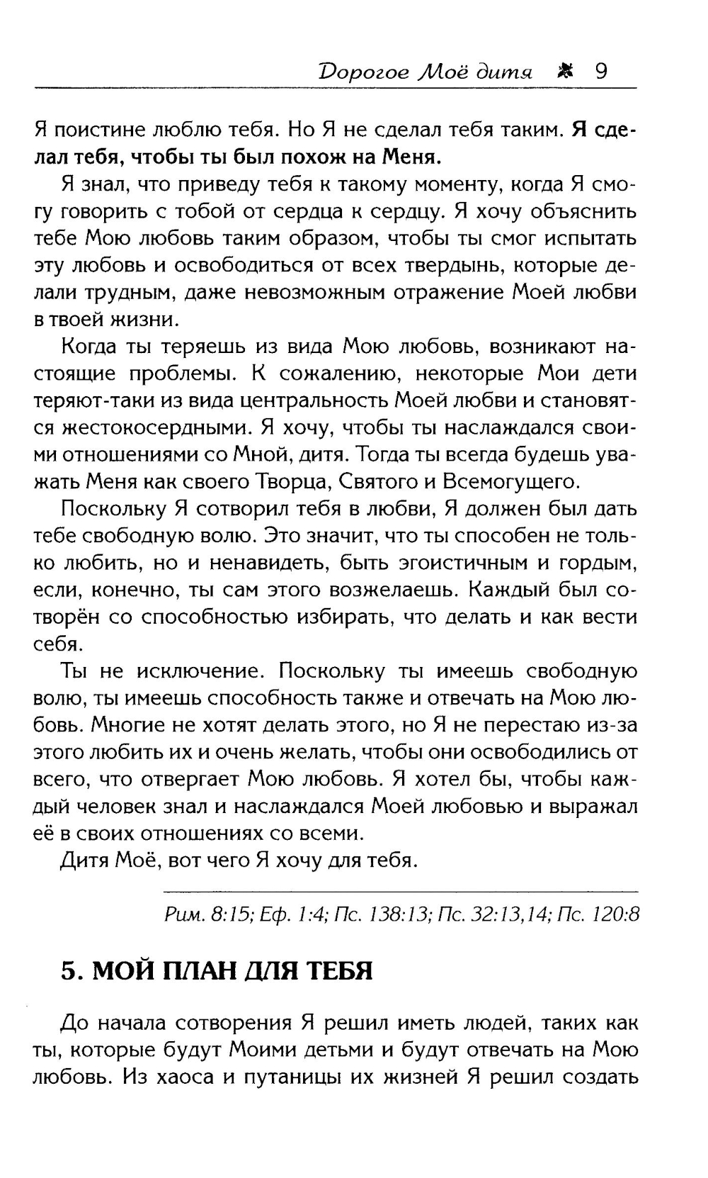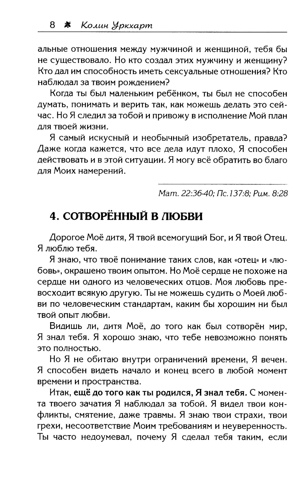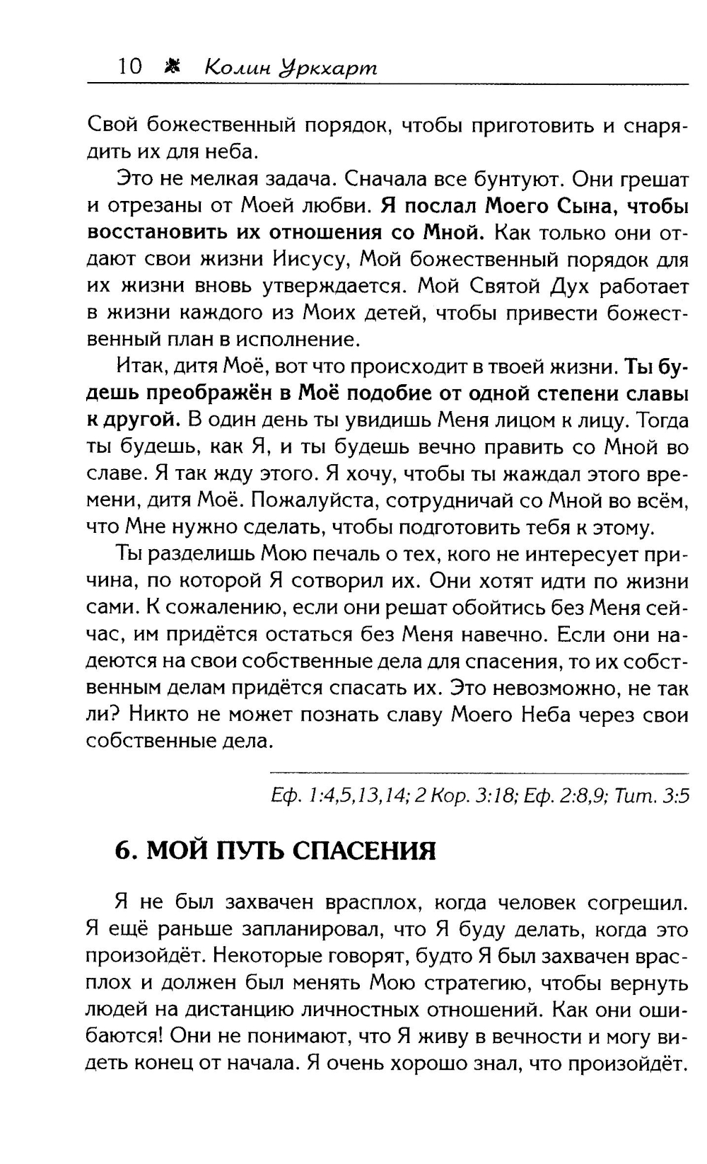 Эта книга написана от сердца Небесного Отца к сердцам Его детей. Очевидно, что это не Писание, и по своему замыслу она никак не может стоять в одном ряду по значимости со Словом Божьим. Пророчество - это один из даров Святого Духа. Эта книга является своего рода пророчеством; и я верю, что многие люди услышат, как Бог говорит с ними и поднимает вопросы, являющиеся для многих серьёзными и насущными. Для написания этой книги Господь попросил меня уединиться на некоторое время, чтобы слушать то, что было в Его сердце. В результате я изменился, как личность, во многих отношениях. Я имею более ясное понимание того, Кто есть Бог и о природе Его любви к каждому из Его детей Это отражено в тексте книги, и я верю, что, читая её, вы получите более ясное откровение о Божьей любви к вам. Господь хотел открыть мне Своё сердце, рассказать о Себе, раскрыть Свою сущность - не только Свою любовь, благодать и милость, но также гнев, справедливость и суд. Из-за плотности моего расписания, я не собирался писать эту книгу, но Господь попросил написать её именно в это неподходящее для меня время. Его просьба ко мне сделала эту задачу радостью, а не бременем. Я считаю огромной привилегией быть призванным Господом, чтобы провести время с Ним и быть Его «рупором». Он очень сильно поднял меня в вере и любви тем, что сказал. Форма этой книги проста, - Бог обращается к верующему в Христа человеку, который находится в личных отношениях с Иисусом, и, следовательно, с Отцом Моя молитва о том, чтобы вы слышали Его голос на этих страницах и лично встретились с Небесным Отцом. Колин Уркхарт| Издательство | МРО ХВЕП Христианская Миссия |