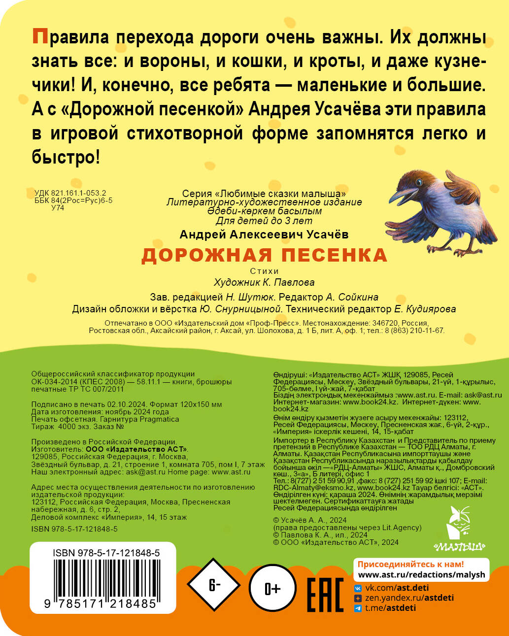 Правила перехода дороги очень важны. Их должны знать все: и вороны, и кошки, и кроты, и даже кузнечики! И, конечно, все ребята - маленькие и большие. А с "Дорожной песенкой" Андрея Усачёва эти правила в игровой стихотворной форме запомнятся легко и быстро! Андрей Алексеевич Усачёв - классик отечественной детской литературы. Его сказки и стихи - весёлые, смешные и вместе с тем поучительные - очень нравятся и маленьким, и взрослым читателям. Эта книга предназначена именно для малышей: в ней яркие рисунки и крупные буквы, плотный картон не порвется при чтении, а скругленные уголки не повредят маленькие пальчики.| Издательство | Издательство "АСТ" |