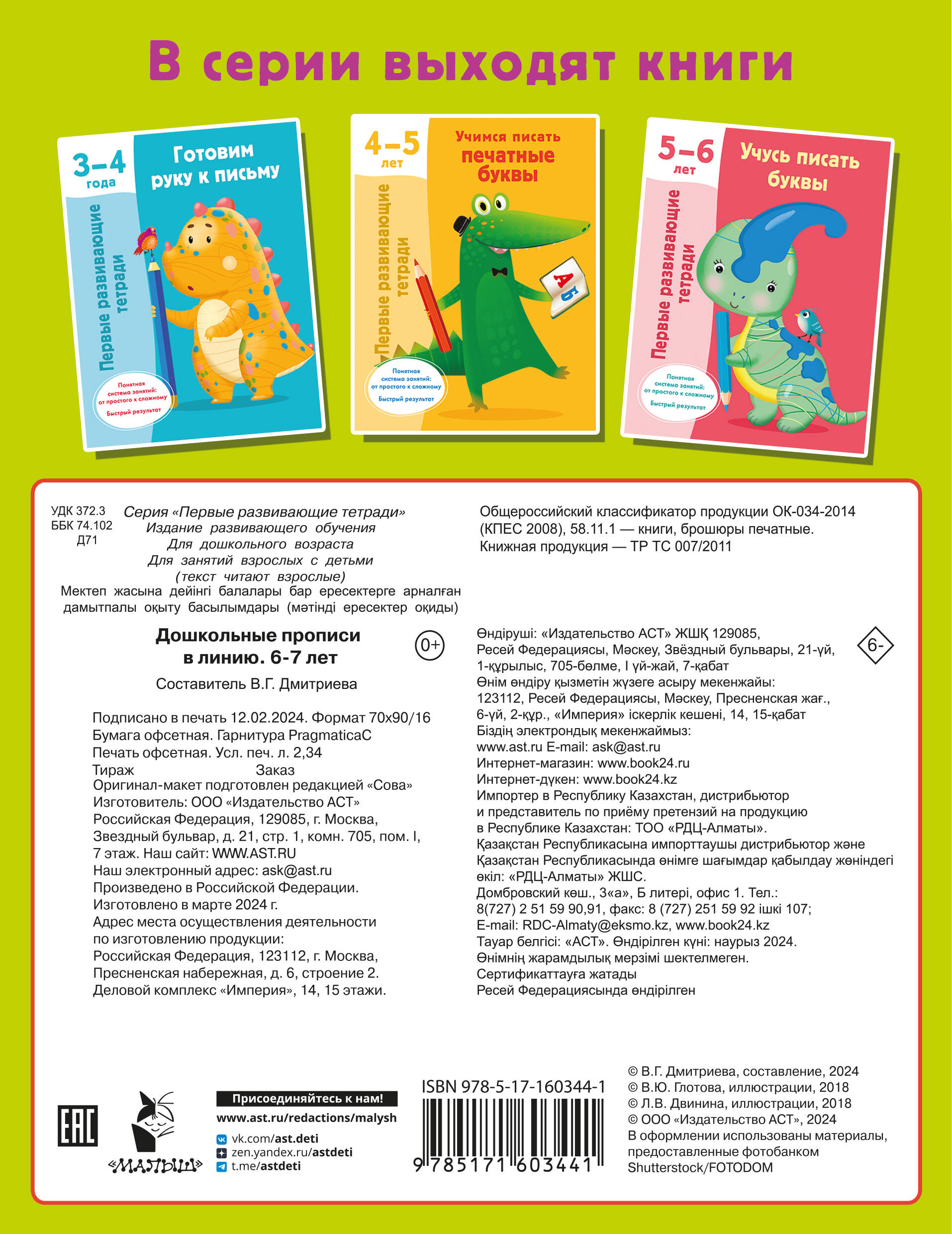 Как научить ребёнка грамотно и красиво писать? Что делать, если малыш постоянно выходит за линейку? На помощь родителям и педагогам придёт универсальная тетрадь «Дошкольные прописи в линию. 6-7 лет». Выполняя задания, ребёнок постепенно научится писать красиво и аккуратно. Юный ученик разовьёт координацию, научится правильно держать ручку, улучшит речь, внимание, память и мышление. Задания построены по принципу от простого к сложному: сначала юный ученик потренируется писать слоги, затем - слова и предложения. Тренажёр подходит как для индивидуальных занятий, так и для групповых. Можно использовать как для проведения уроков в классе, так и для занятий дома.| Издательство | Издательство "АСТ" |