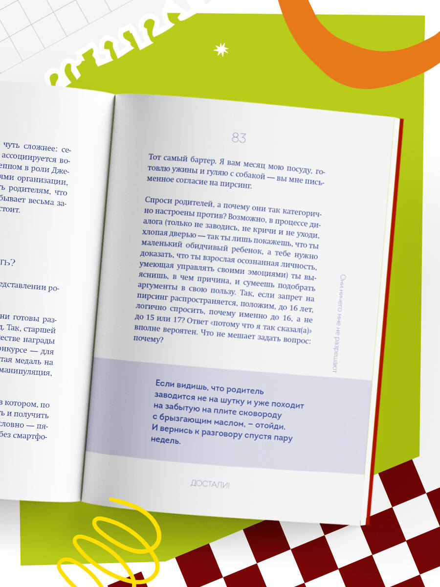 Self-help для подростков - это серия книг по саморазвитию для тех, кто еще не стал взрослым, но уже не чувствует себя ребенком. Здесь сложные темы рассказываются простыми словами, чтобы каждый подросток научился лучше понимать себя и окружающих. ____ Устали от постоянных родительских нотаций и запретов? Чувствуете, будто ваша жизнь превратилась в сплошной кошмар из-за бесконечных требований? Пора покончить с этим. В этой яркой, увлекательной и забавной книге Людмила Чиркова, журналист и мама троих детей (включая двух подростков), выдает весь арсенал знаний и хитростей, чтобы помочь вам понять своих родителей. Она знает, каково это - быть подростком, ведь и сама когда-то прошла через этот этап! Вместе вы разберете, почему родители такие, какие они есть, и, главное - как научиться взаимодействовать с ними, не теряя себя. ЦИТАТЫ: Задача этой книги вовсе не сделать подростков главными в вашей семье, а помочь им научиться жить с вами дружно, а вам - с ними. Ограничения нужны не для того, чтобы тебя ущемить в правах, а чтобы выстроить вокруг тебя безопасное пространство. Мы, взрослые, просто не умеем лениться, чилить, получать удовольствие от жизни. Мы переживаем не о том, что ты сидишь в телефоне, а о том, что, как нам кажется, ты ни черта не делаешь и спускаешь свою жизнь в унитаз, когда мог бы выучить английский, освоить язык программирования типа Python и прочитать все то, на что у нас самих сейчас нет времени. Рассказывай о своих планах, и правдиво. Это тоже про доверие. Родители любят послушных и удобных детей, даже если в курсе, что послушание и удобство не очень совместимы с реальной жизнью и вообще вредят ментальному здоровью во взрослом возрасте. Родителям очень трудно принять твой выбор, потому что это означает признать, что ты взрослеешь и больше не их маленькая девочка или мальчик, и волен сам принимать решения. Родители порой готовы душу дьяволу продать за возможность побыть с подростком по его доброй воле. В нашей стране татуировки носят негативную коннотацию и ассоциируются у многих с криминальными кругами. Даже красивые, даже цветочки, бабочки и латинские крылатые выражения. Вот такое когнитивное искажение. ОТЗЫВ: «Слово "достали" на обложке этой книги - хорошее, яркое, продающее. Но на самом деле книга, конечно, не про борьбу с родителями и не про намеренное им противостояние. Она про то, как слушать и слышать друг друга, про то, как учиться разговаривать - без манипуляций, по-взрослому, в границах. И про то, что именно это в конечном счете и работает - и с родителями, и со всеми остальными людьми». - Акимова Елена Игоревна, директор по контенту медиа «Мел»| Издательство | ООО "Издательство "Эксмо" |