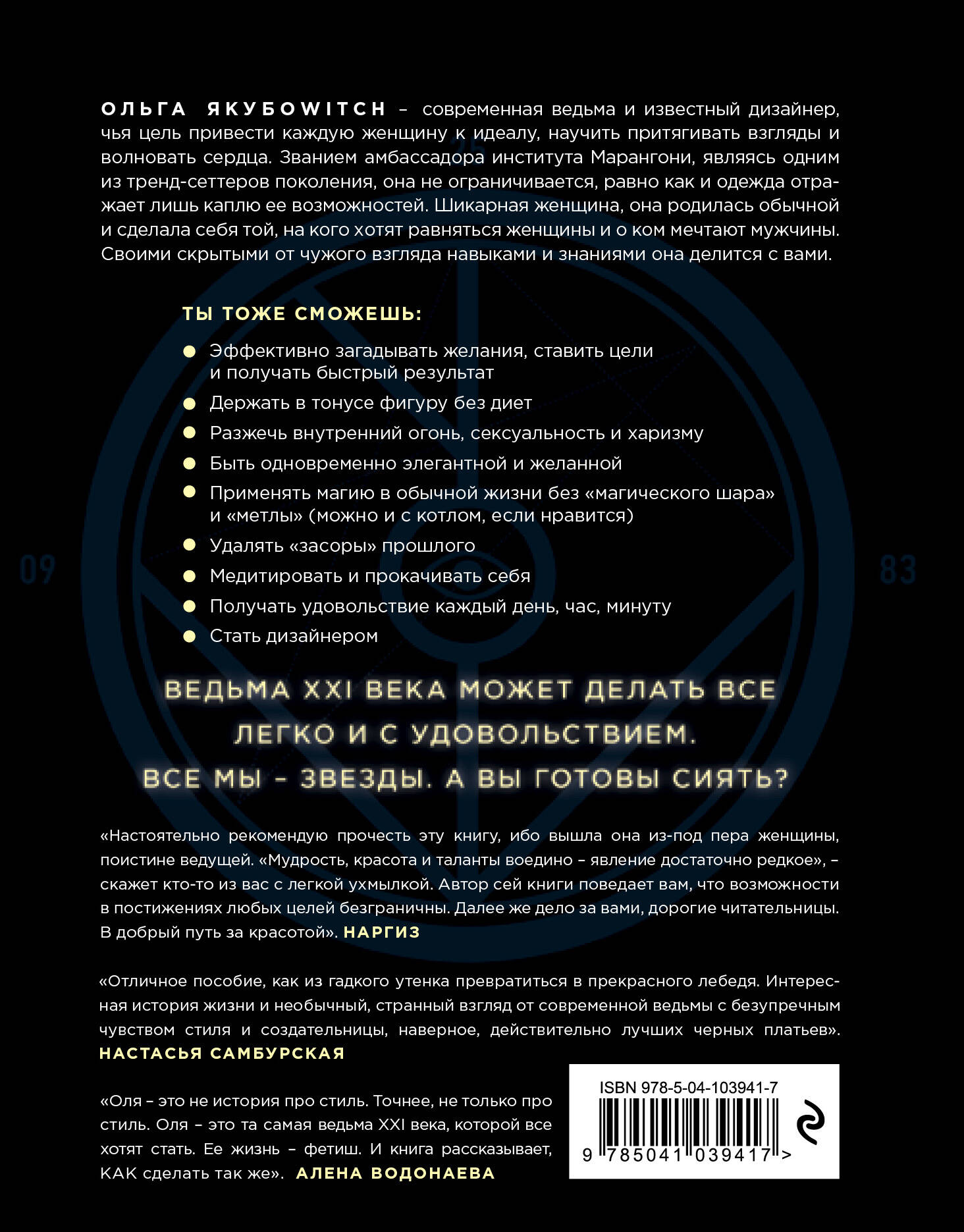 Ольга Якубович - модельер и создательница своего бренда одежды YAKUBoWITCH, названная Dark lady в ISTITUTO MARANGONI и известная как ведьма в России, еще никого не оставила равнодушным. Как лучшей подруге, она поведает тебе свою историю и поделится своими секретами успеха, стиля, ухода за собой и духовного равновесия. Современная ведьма может всё, и ты тоже сможешь: • Обрести внутреннюю гармонию. • Увеличить энергию. • Упорядочить мысли и чувства. • Наладить связь со своим телом. • Достичь успеха. • Сделать идеальный макияж и ретроукладку. • Подобрать обувь на все случаи жизни. • Стать дизайнером. • Быть идеальной. • Достать до Луны. Пришла пора сиять!| Издательство | ООО "Издательство "Эксмо" |
