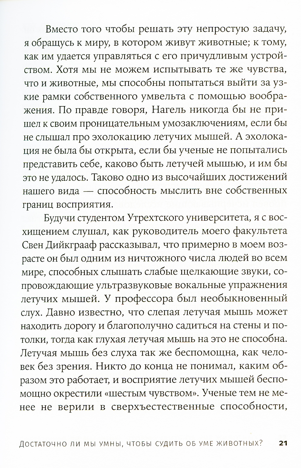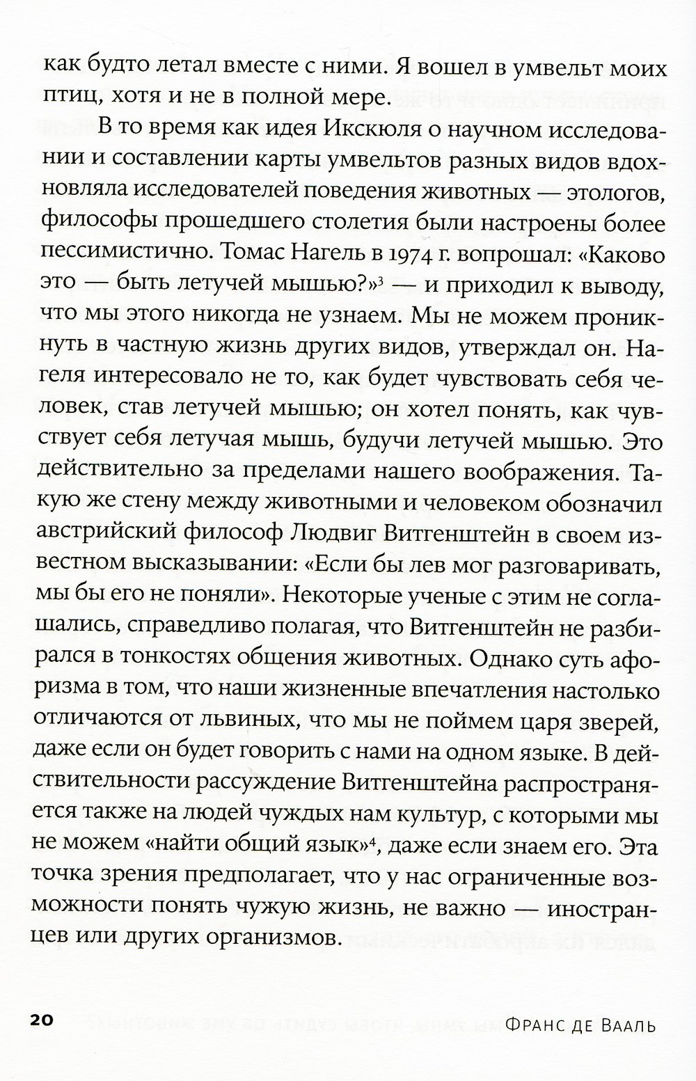 Какие способы коммуникации практикуют животные и есть ли у них подобие речи? Могут ли животные узнавать себя в зеркале? Свойственны ли животным дружба и душевная привязанность? Ведут ли они войны и мирные переговоры? Книга известного приматолога Франса де Вааля отвечает на эти вопросы в контексте эволюции познания - нового научного направления, получившего мощное развитие в последнее десятилетие. Автор рассказывает об истории этой науки, о жестоких спорах с бихевиористами, а главное - об огромной экспериментальной работе и наблюдениях за естественным поведением животных. Анализируя пути становления мыслительных процессов в ходе эволюционной истории различных видов, ученый убедительно показывает, что человек в этом ряду - лишь одно из многих мыслящих существ.