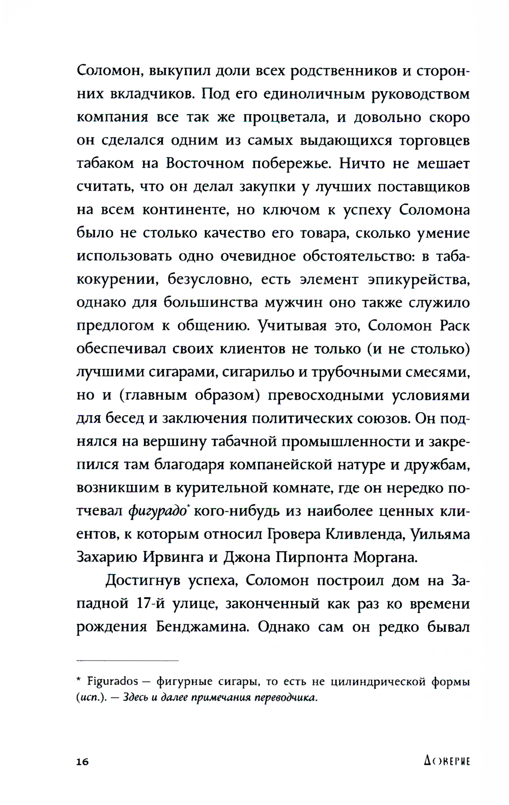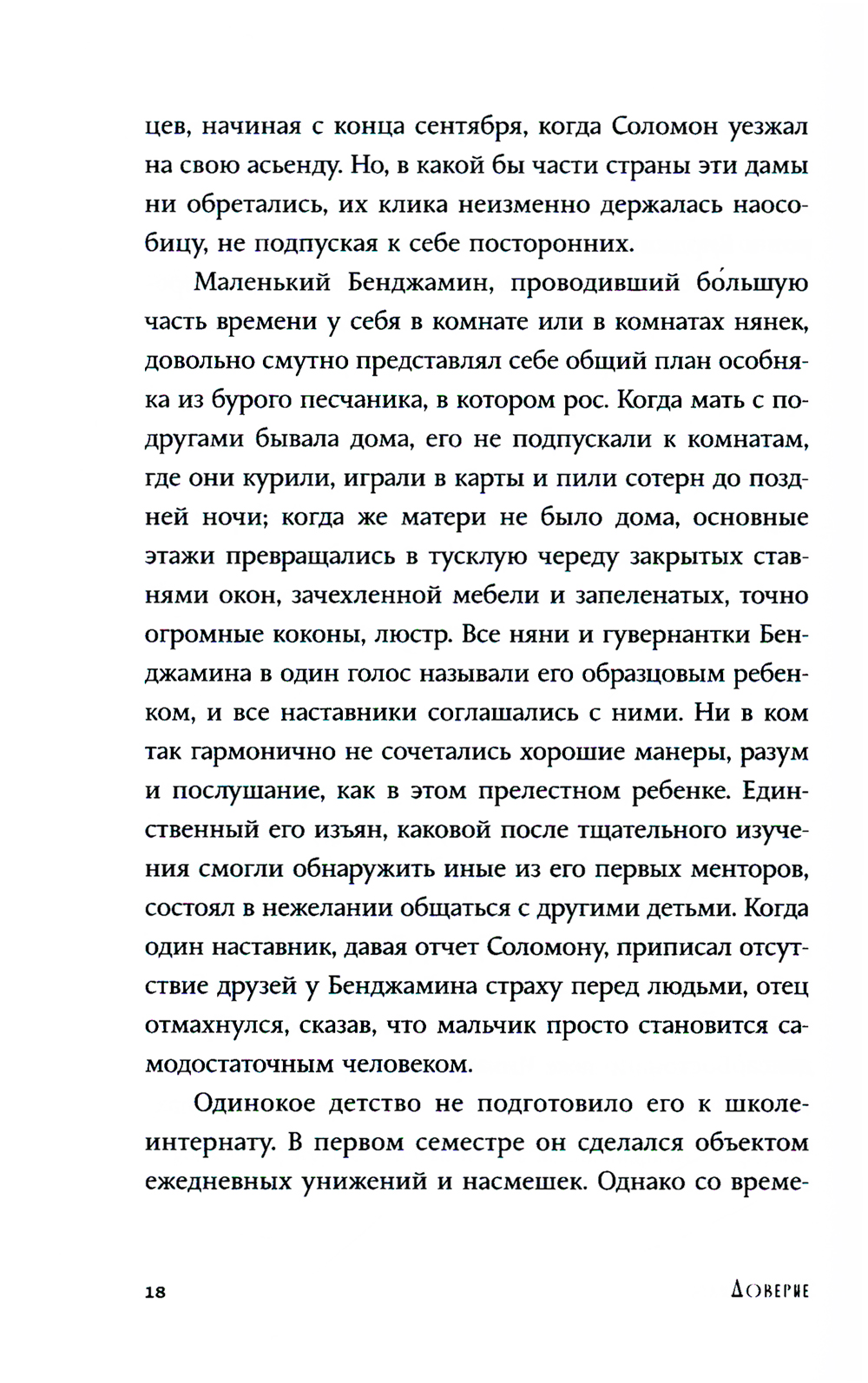 Даже рев и грохот бурных двадцатых не могли заглушить их имена. Он легендарный магнат с Уолл-стрит, она - дочь эксцентричных аристократов. Вместе они поднялись на вершину мира, полного иллюзии безграничного богатства. Но какую цену они заплатили за столь огромное состояние? Мы узнаем об этом из нескольких источников. Из книги о жизни миллионера. Из его собственных мемуаров. От машинистки, которая записывает их и замечает, что история и реальность начинают расходиться. И - из дневников его жены. Чей голос честнее, а кто самый ненадежный рассказчик? Как вообще представления о реальности сосуществуют с самой реальностью? «Доверие» - одновременно захватывающая история и блестящая литературная головоломка.| Издательство | Строки |