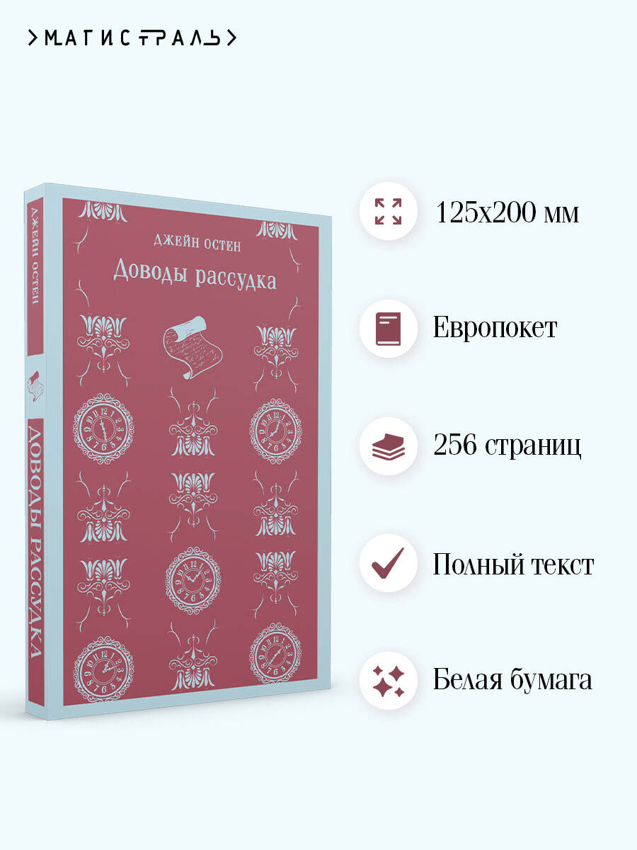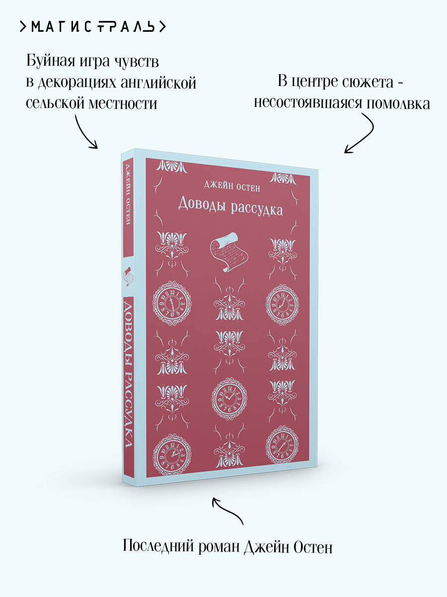 Впервые опубликованный в 1818 году, роман «Доводы рассудка» был последней работой Джейн Остен. Действие происходит в графстве Сомерсет и в Бате. В центре сюжета - несостоявшаяся помолвка Энн с капитаном Фредериком Уэнтуортом, моряком, которого Энн встретила и полюбила, когда ей было 19 лет. Тогда Уэнтуорт считался неподходящей партией из-за его бедности, и Энн была вынуждена разорвать отношения. И вот восемь лет спустя они снова встречаются. К этому времени капитан Уэнтуорт разбогател на флоте, и сейчас для многих он привлекательная «добыча». Как же теперь сложатся их отношения? «Доводы рассудка» порадуют любого читателя тонко прорисованными персонажами, легкой сатирой и очаровательным воссозданием мира английской сельской местности XIX века. В июле 2022 вышла долгожданная экранизация «Доводов рассудка» от Netflix со звездами мирового масштаба в главных ролях (Дакотой Джонсон, Ричардом Грантом, Генри Голдингом) в подлинных британских локациях.| Издательство | ООО "Издательство "Эксмо" |