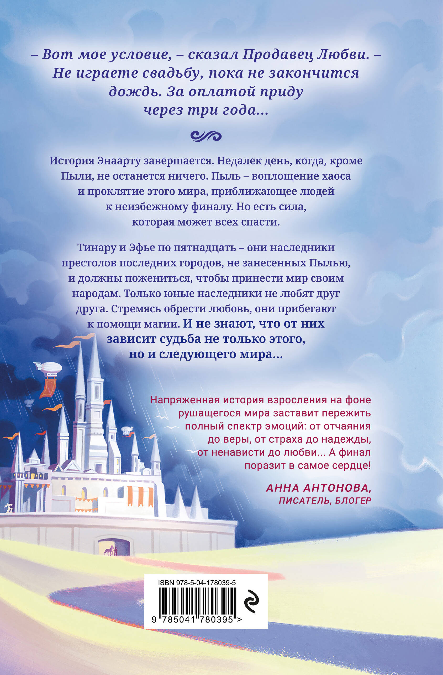 История Энаарту завершается. Недалек день, когда, кроме Пыли, не останется ничего. Пыль - воплощение хаоса и проклятие этого мира, приближающее людей к неизбежному финалу. Но есть сила, которая может всех спасти. Тинару и Эфье по пятнадцать - они наследники престолов последних городов, не занесенных Пылью, и должны пожениться, чтобы принести мир своим народам. Только юные наследники не любят друг друга. Стремясь обрести любовь, они прибегают к помощи магии. И не знают, что от них зависит судьба не только этого, но и следующего мира… «Напряженная история взросления на фоне рушащегося мира заставит пережить полный спектр эмоций: от отчаяния до веры, от страха до надежды, от ненависти до любви... А финал поразит в самое сердце!» - Анна Антонова, писатель, блогер *На страницах вы встретите названия музыкальных композиций, которые подобраны автором, чтобы дополнить и разнообразить впечатления от истории. В начале книги они собраны в плейлист, их можно прослушать, отсканировав QR-код.| Издательство | ООО "Издательство "Эксмо" |