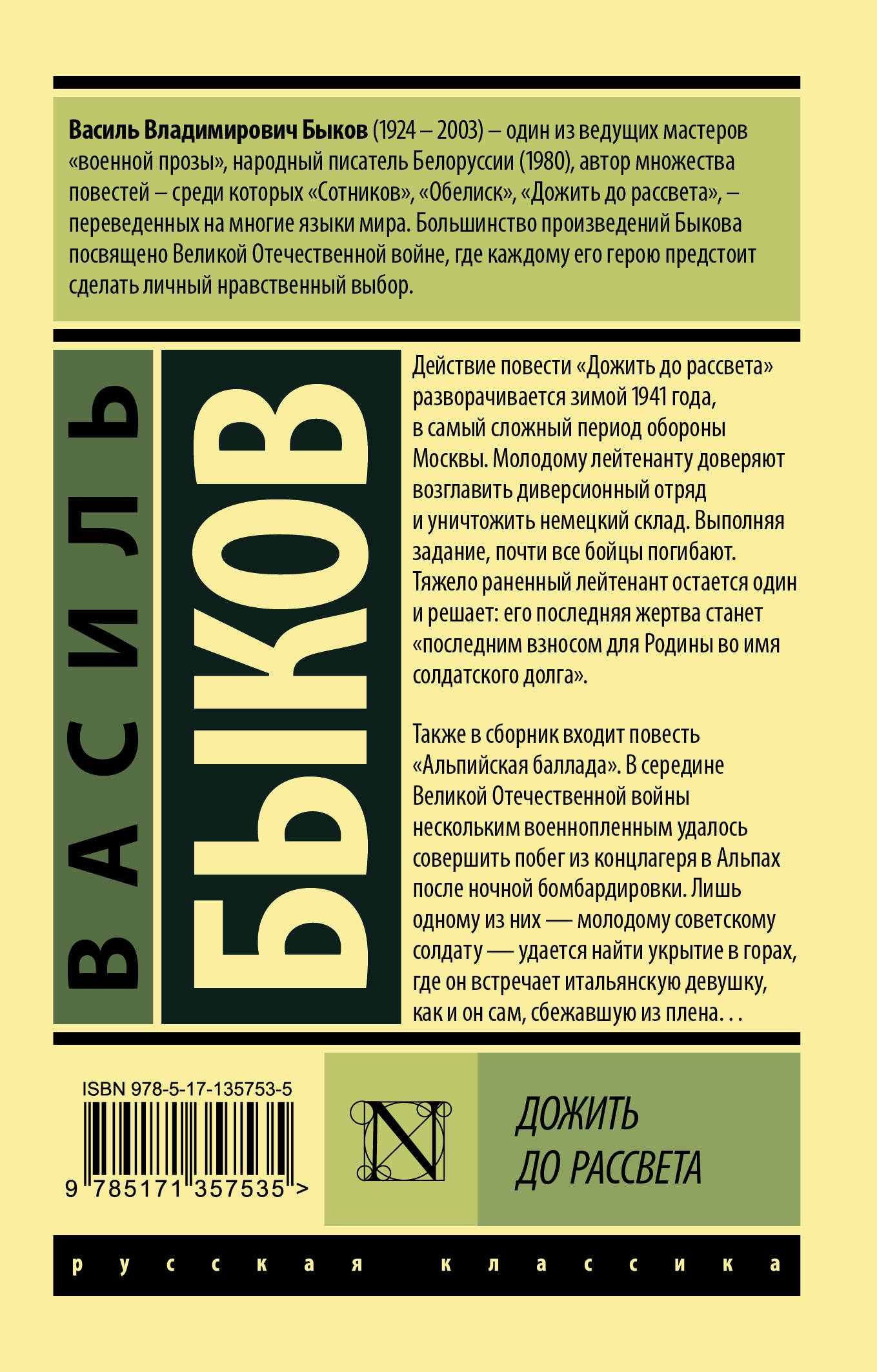 Действие повести "Дожить до рассвета" разворачивается зимой 1941 года, в самый сложный период обороны Москвы. Молодому лейтенанту доверяют возглавить диверсионный отряд и уничтожить немецкий склад. Выполняя задание, почти все бойцы погибают. Тяжело раненный лейтенант остается один и решает: его последняя жертва станет "последним взносом для Родины во имя советского долга". Также в сборник входит повесть "Альпийская баллада". В середине Великой Отечественной войны нескольким военнопленным удалось совершить побег из концлагеря в Альпах после ночной бомбардировки. Лишь одному из них - молодому советскому солдату - удается найти укрытие в горах, где он встречает итальянскую девушку, как и он сам, сбежавшую из плена...| Издательство | ИЗДАТЕЛЬСТВО "АСТ" |