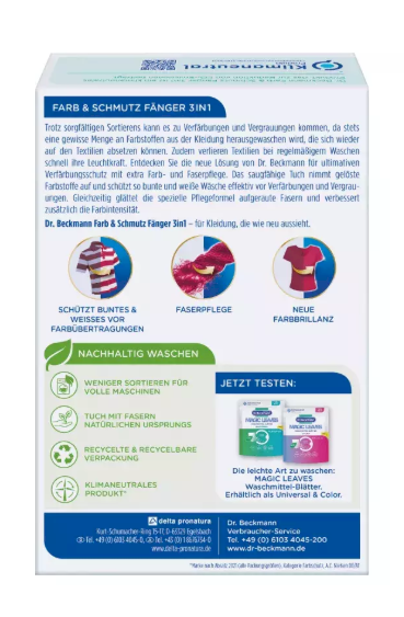 Одноразовые салфетки Dr. Beckmann Paint and Dirt Collection Cloths (40 шт.) - это практичные салфетки для сбора краски, грязи, пыли и жировых частиц при стирке или других уборочных задачах. Изготовленные из высокоабсорбирующих волокон, эти салфетки помогают предотвращать перекраску тканей, осаждение частиц на одежду и образование следов, благодаря чему одежда и текстиль остаются чище и ярче. Идеальны как для защиты цвета при стирке смешанных загрузок, так и для очистки поверхностей после покраски или домашних работ. Просто поместите салфетку в барабан стиральной машины или используйте вручную для протирки поверхностей, затем утилизируйте после использования.