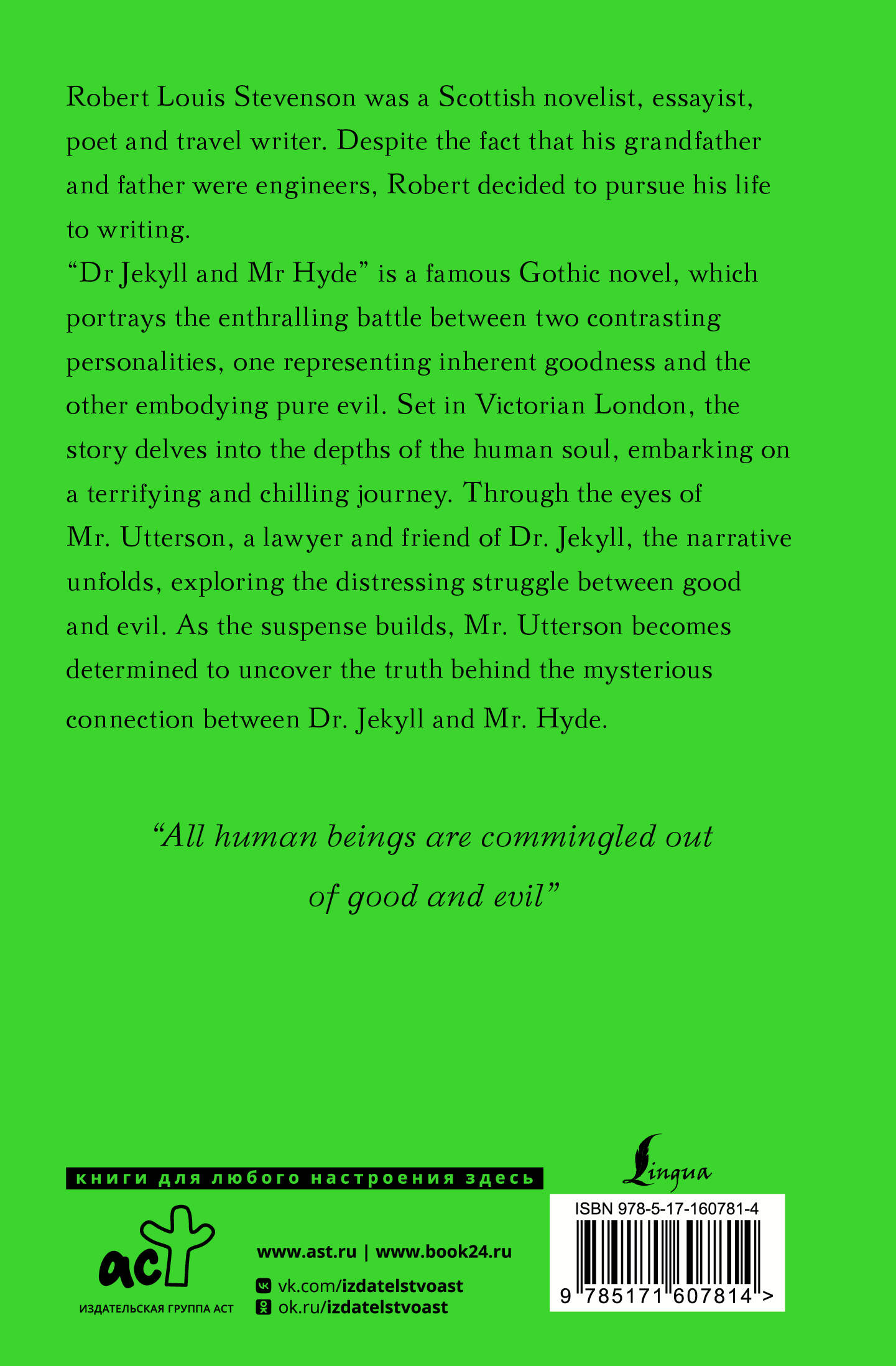Роберт Льюис Стивенсон (1850-1894) - шотландский писатель и поэт. Родился в семье инженеров, но не стал продолжать семейную традицию и получил высшее образование в Эдинбургском университете на юридическом факультете, хотя изначально учился на инженера. Повесть "Доктор Джекил и мистер Хайд" Стивенсона была опубликована в 1886 году. В ней автор рассуждает на тему двойничества и пытается её переосмыслить. Сюжет повествует о странных событиях, происходящих в Лондоне, непосредственное участие в которых принимает Эдвард Хайд - жестокий и отвратительный человек. Эти события привлекают внимание господина Аттерсона, который работает нотариусом. Хайд каким-то образом связан с другом Аттерсона - доктором Джекилом. Именно этой связью интересуется нотариус. Он решает углубиться в вопрос и попытаться докопаться до истины. Чем же закончится это расследование? Ответ таится на страницах книги. В книге представлены три увлекательных произведения - "Доктор Джекил и мистер Хайд", "Злоключения Джона Николсона" и "Маркхейм". Произведения представлены в оригинале. Насладитесь историями без адаптации и сокращений!| Издательство | Издательство "АСТ" |