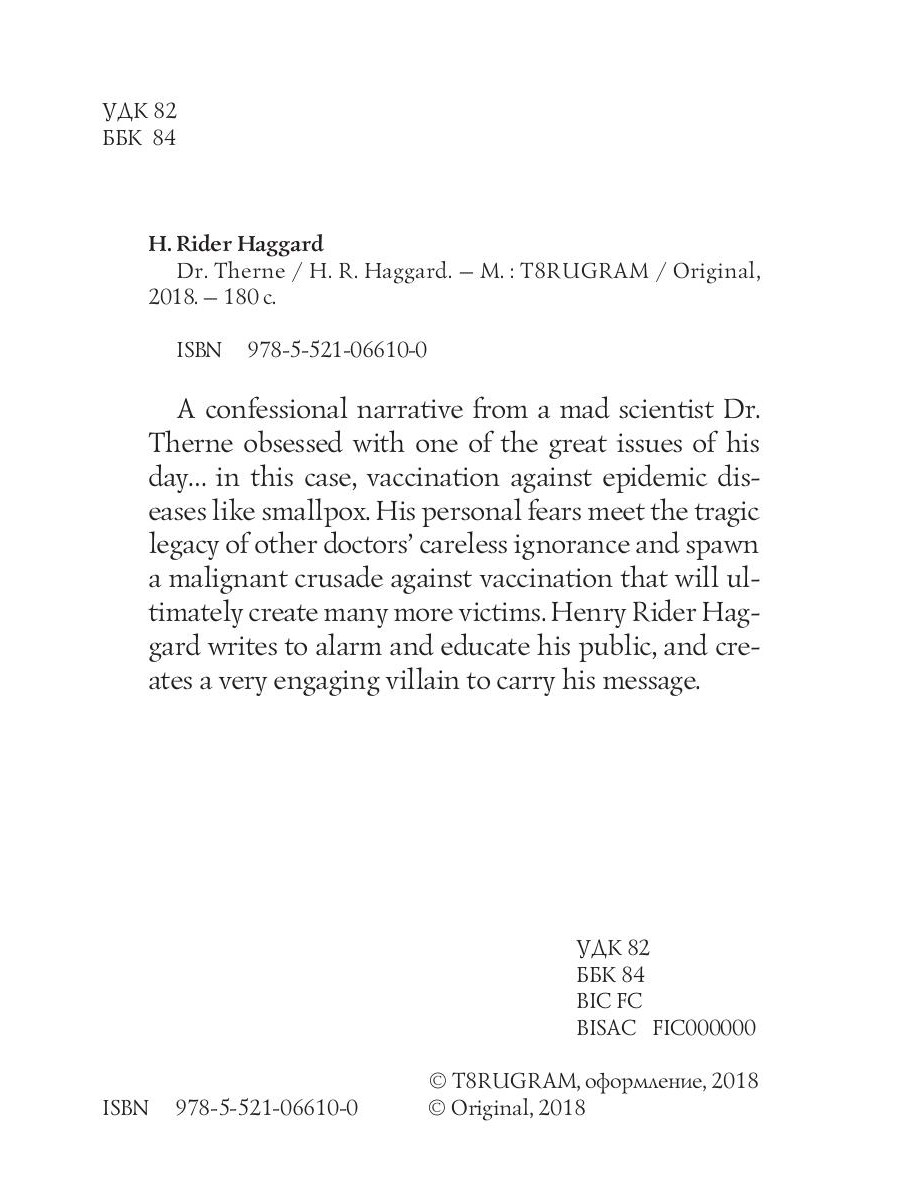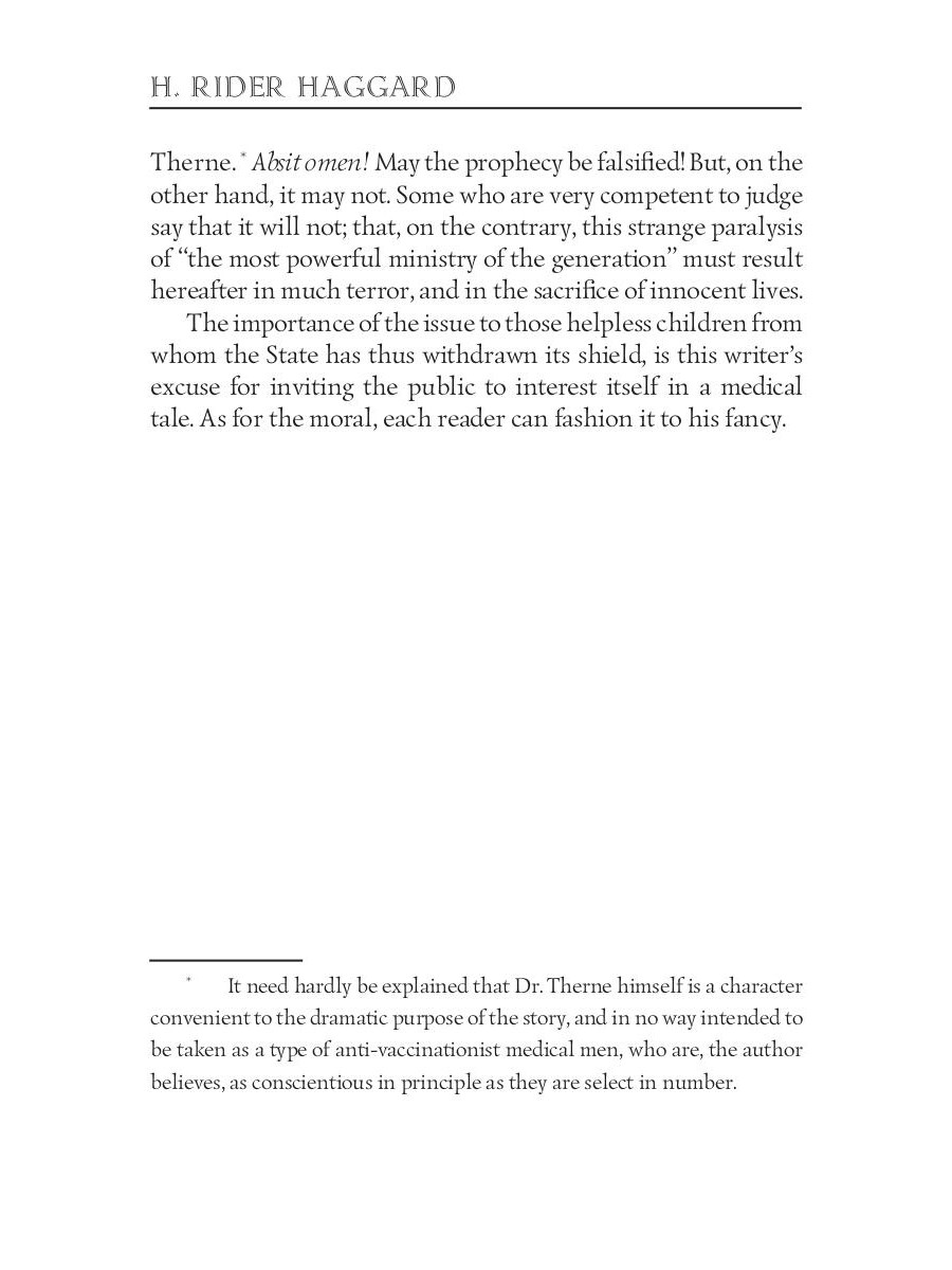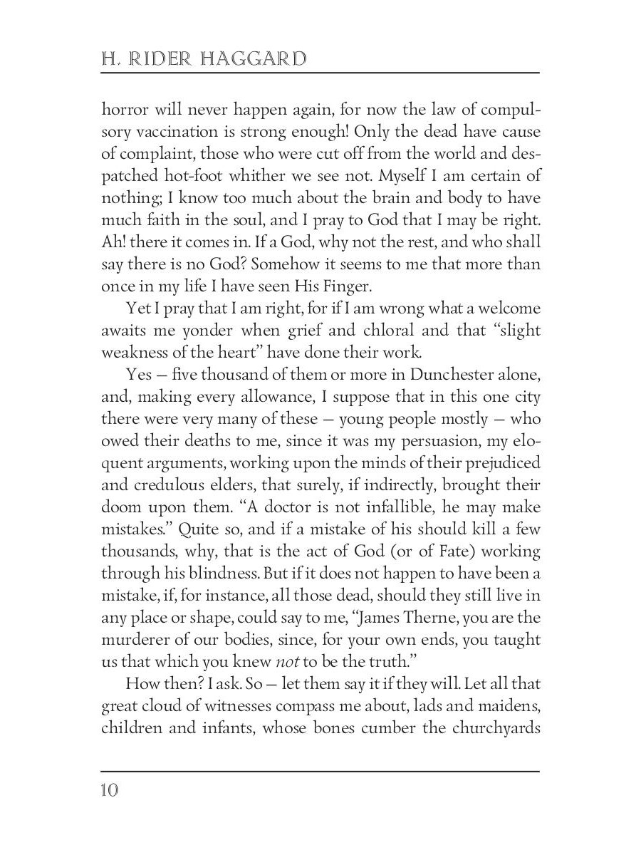 A confessional narrative from a mad scientist Dr. Therne obsessed with one of the great issues of his day... in this case, vaccination against epidemic diseases like smallpox. His personal fears meet the tragic legacy of other doctors' careless ignorance and spawn a malignant crusade against vaccination that will ultimately create many more victims. Henry Rider Haggard writes to alarm and educate his public, and creates a very engaging villain to carry his message.