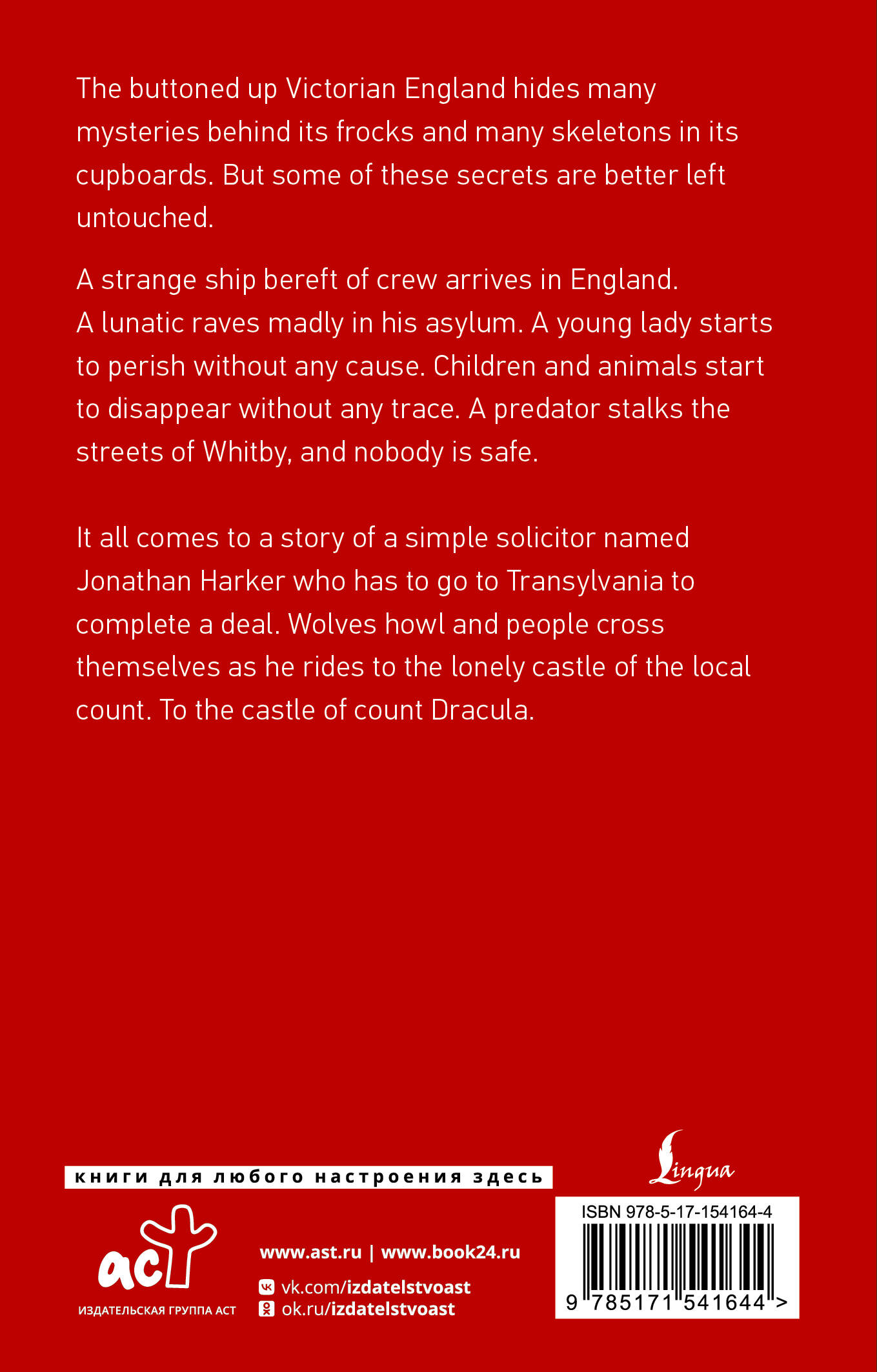 Издание на английском языке. Глаза наливаются красным от плохих переводов? Читайте "Дракулу" в оригинале! Брэм Стокер откроет перед вами мир обволакивающего ужаса столкновения со сверхъестественным. "Дракула" - один из первых романов о вампирах. Он подарил бессмертную славу Брэму Стокеру и породил целую плеяду подражателей. Вместе с героями вы столкнетесь с могучей нежитью в Викторианские времена, когда само слово "вампир" ещё не было на слуху. Слог Стокера тягуч и многословен, но ему, как никому другому, удается создать липкое ощущение страха и бессилия. Книга издана в неадаптированной версии. Наслаждайтесь готическим хоррором Брэма Стокера в оригинале!