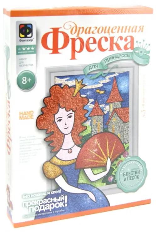 В наборе: песок, основа-трафарет с высеченными контурами, набор разноцветных блесток, кисть, салфетка, заготовка для рамки, шаблон-инструкция.