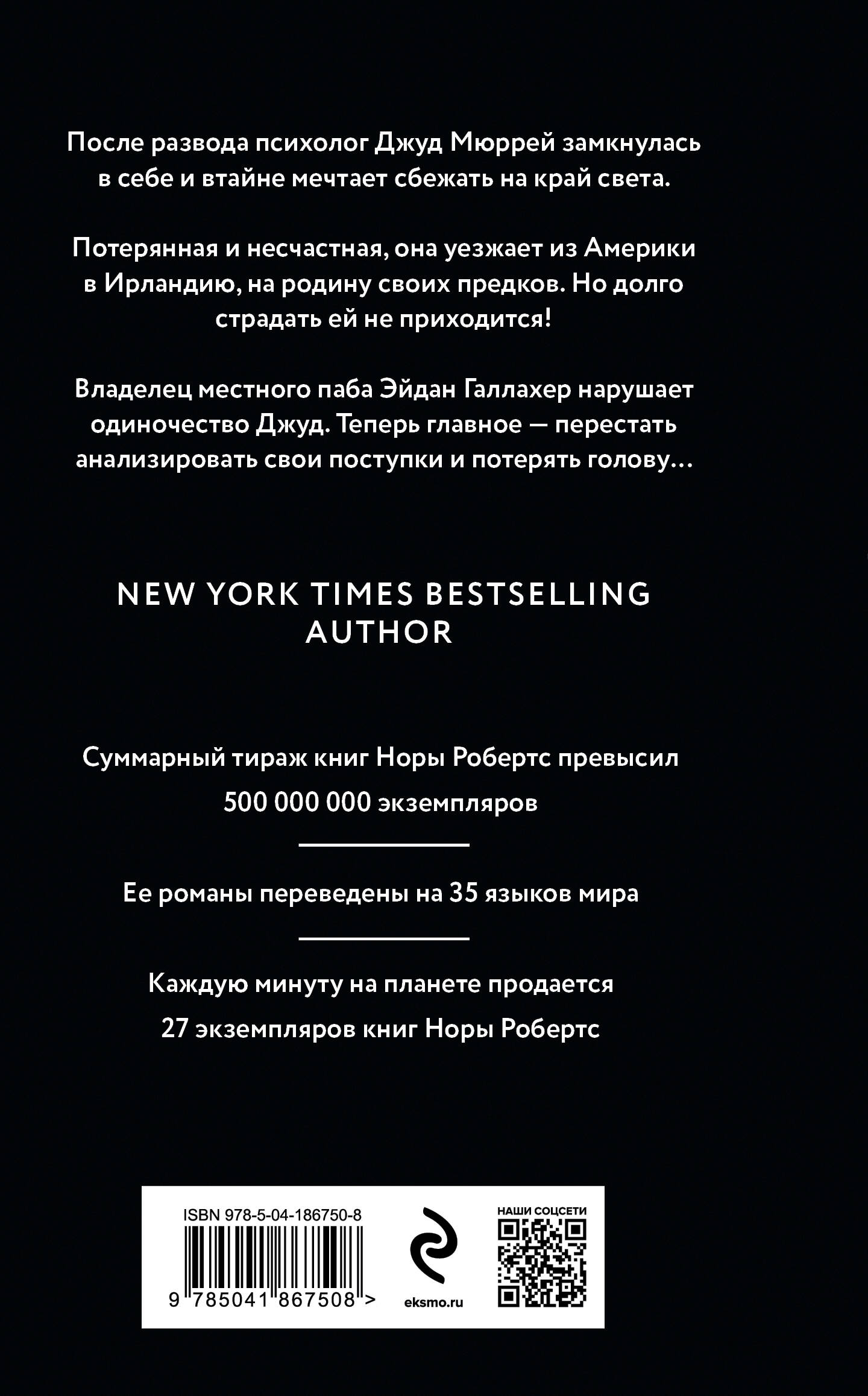 Любимая трилогия Норы Робертс в новом переводе. Нора Робертс - самая популярная американская писательница, чьи романы любят и российские читательницы. Суммарный тираж книг Норы Робертс превысил 500 млн экземпляров. Ее романы переведены на 35 языков мира. Каждую минуту на планете продается 27 экземпляров книг Норы Робертс. После развода психолог Джуд Мюррей замкнулась в себе и втайне мечтает сбежать на край света. Потерянная и несчастная, она уезжает из Америки в Ирландию, на родину своих предков. Но долго страдать ей не приходится! Владелец местного паба Эйдан Галлахер нарушает одиночество Джуд. Теперь главное - перестать анализировать свои поступки и потерять голову…| Издательство | ООО "Издательство "Эксмо" |