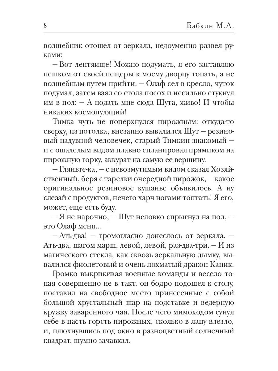 И снова волшебному миру, в котором Тимка стал уже своим человеком, грозит беда. Два чудовища, одно другого ужаснее, пробудились от векового сна и сошлись в смертельной схватке, сея страх и разрушение. Помочь одолеть злую силу могут драконы, что живут в горах, далеко за морем. И Тимка со своим верным другом-рыцарем отправляется к драконьему царю. На пути друзьям встречаются серые призраки и заколдованные дворцы, говорящие деревья и свирепые пираты. Наконец путники попадают в таинственный зеркальный замок…| Издательство | Т8 RUGRAM |